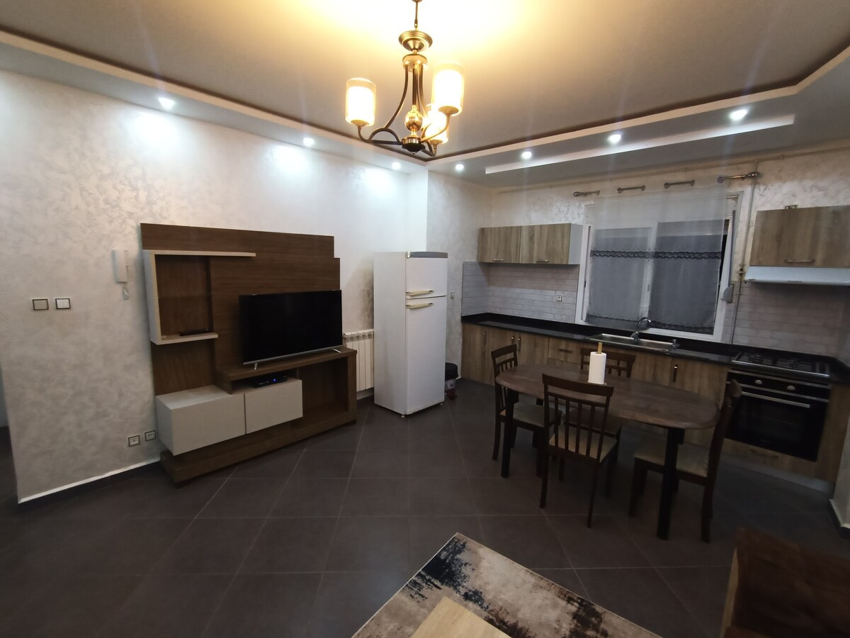멋진 현대식 아파트, 에어컨, 지젤에서 휴가를 보내기에 좋은 위치, 150m의 바우나르 해변에서 가깝고, 레스토랑과 슈퍼마켓이 40m, 약국 및 모스크에서 100m, 지젤 도심까지 5분 거리이며, 지하 주차장, 수상 H24, 초고속 인터넷, 필요한 경우 아기를 위한 추가 침대가 있습니다.
