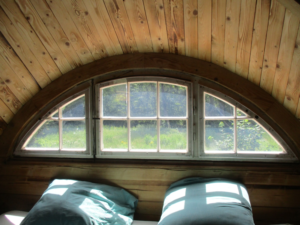 Das Häuschen steht im Wald, gesäumt von einer Fichte und einer Tanne. Die Einrichtung ist einfach. Es gibt einen kleinen Bereich zum Kochen - Gasherd, Kühlschrank und Küchenutensilien sind da. Ein kleines Bad mit Dusche befindet sich direkt neben dem Eingang. Im Wohnbereich steht ein Sofa, dass bei Bedarf als Schlafgelegenheit genutzt wird. Über die Treppe gelangt man auf den Schlafboden.