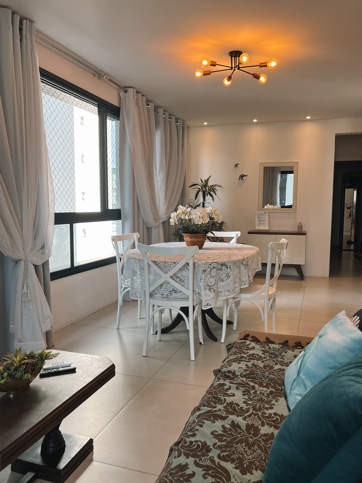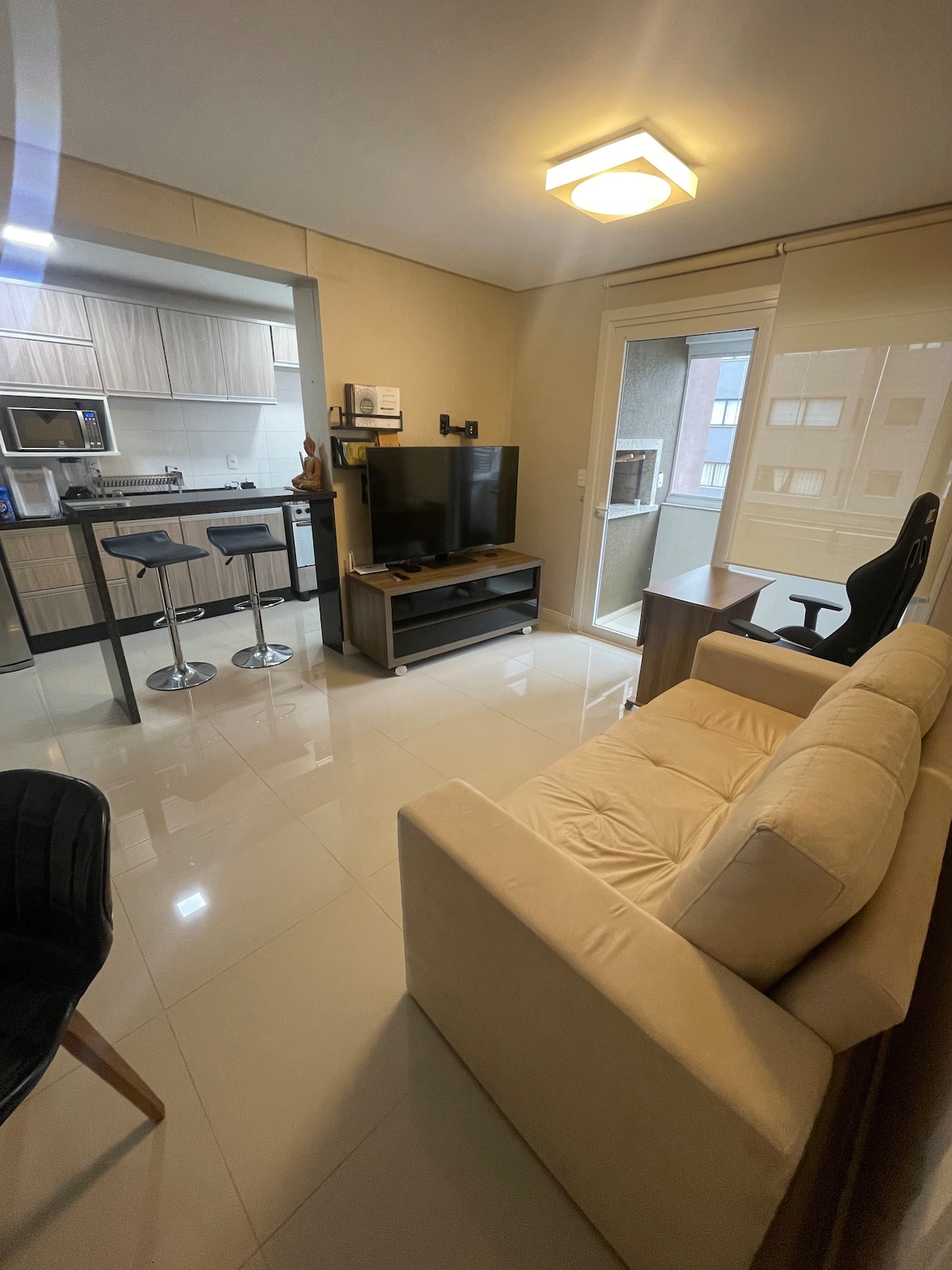 Complete apartment in the city center, close to markets, cinema, restaurants and shops. Less than 5 minutes from the sea! 😃 The apartment has a bedroom, living room, bathroom and kitchen/utility area, fully furnished and ready for use. In the living room, the apartment has a double-size sofa bed. Sea views from both the apartment and the terrace, which has a swimming pool, gym and leisure area. Also includes TV with Netflix and other streaming services (not included), barbecue and garage