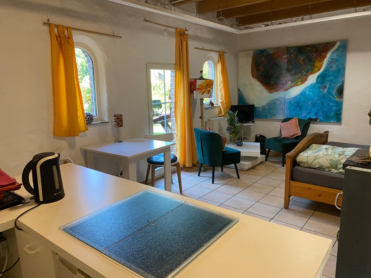 도보 거리에 있는 딕 성을 즐기며 시골 풍경을 즐겨보세요. 자전거 도로와 산책로가 여러 개 있으며, 고속도로(A46)가 차로 단 몇 분 거리에 있습니다. 2km 이내에 베이커리 2개와 과일 가게가 있습니다. 헛간은 원래 벽돌 벽 4개를 유지하면서 완전히 개조되었습니다. 바닥 난방이 구비되어 있으며 로프트 스타일의 공간을 제공합니다. 출입은 공용 안뜰에서 이루어지며 뒷편에서 정원을 즐길 수 있습니다. 지붕이 있는 게이트 공간은 자전거와 오토바이를 주차하기에 이상적입니다.