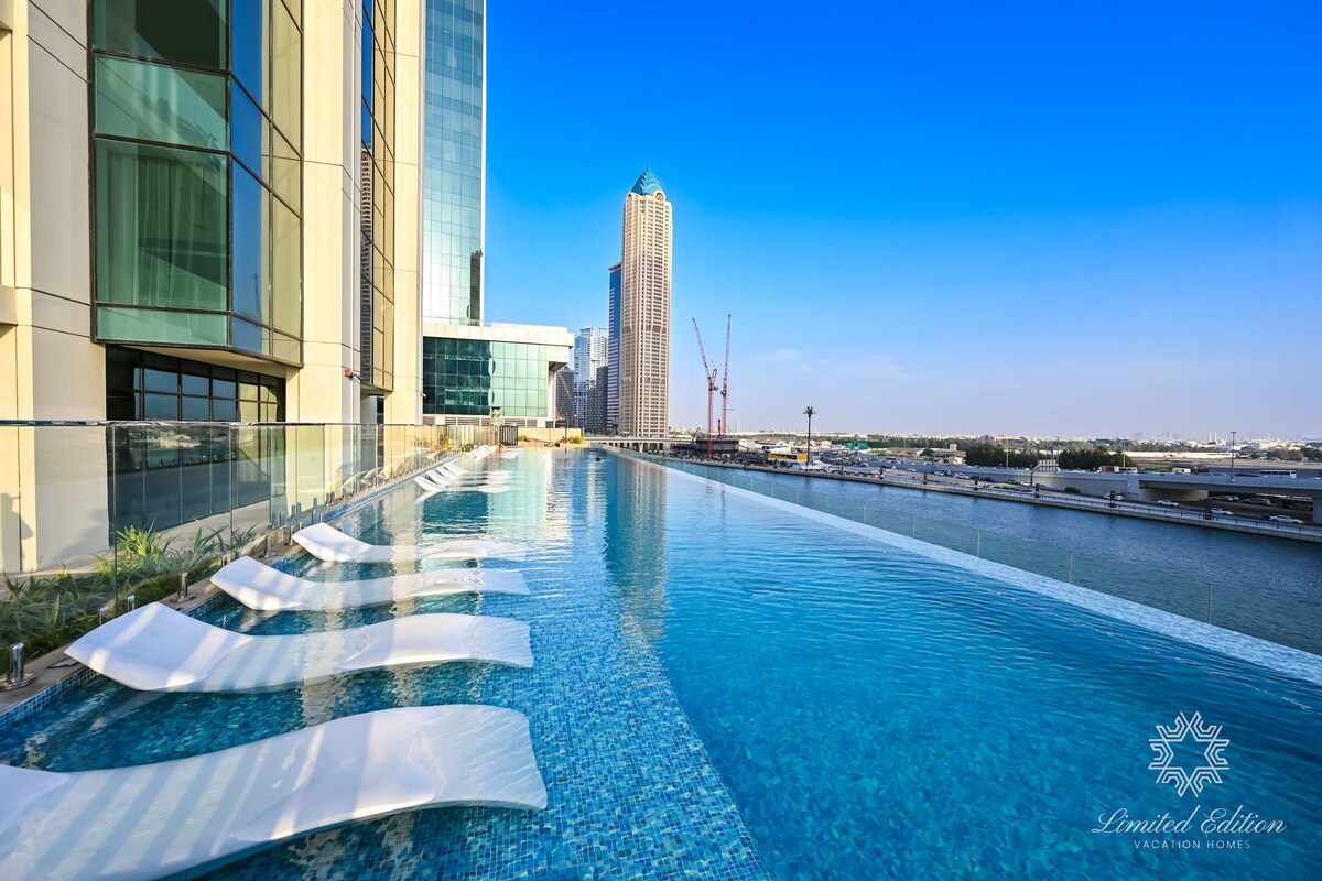 Stay in 5-Star Luxury with Dubai’s Highest Infinity Pool! Escape to our 33rd-floor apartment in Business Bay, featuring 1 bedroom, 1.5 bathrooms, and stunning views. Located just 5 minutes from Dubai Mall and 4 minutes to the Metro, all prime spots are within easy reach. Exclusive Offer: ★ Complimentary airport transfers for stays of 21+ days. ★ 20% off building amenities, including Bars, Restaurants, Beauty Salon and Spa