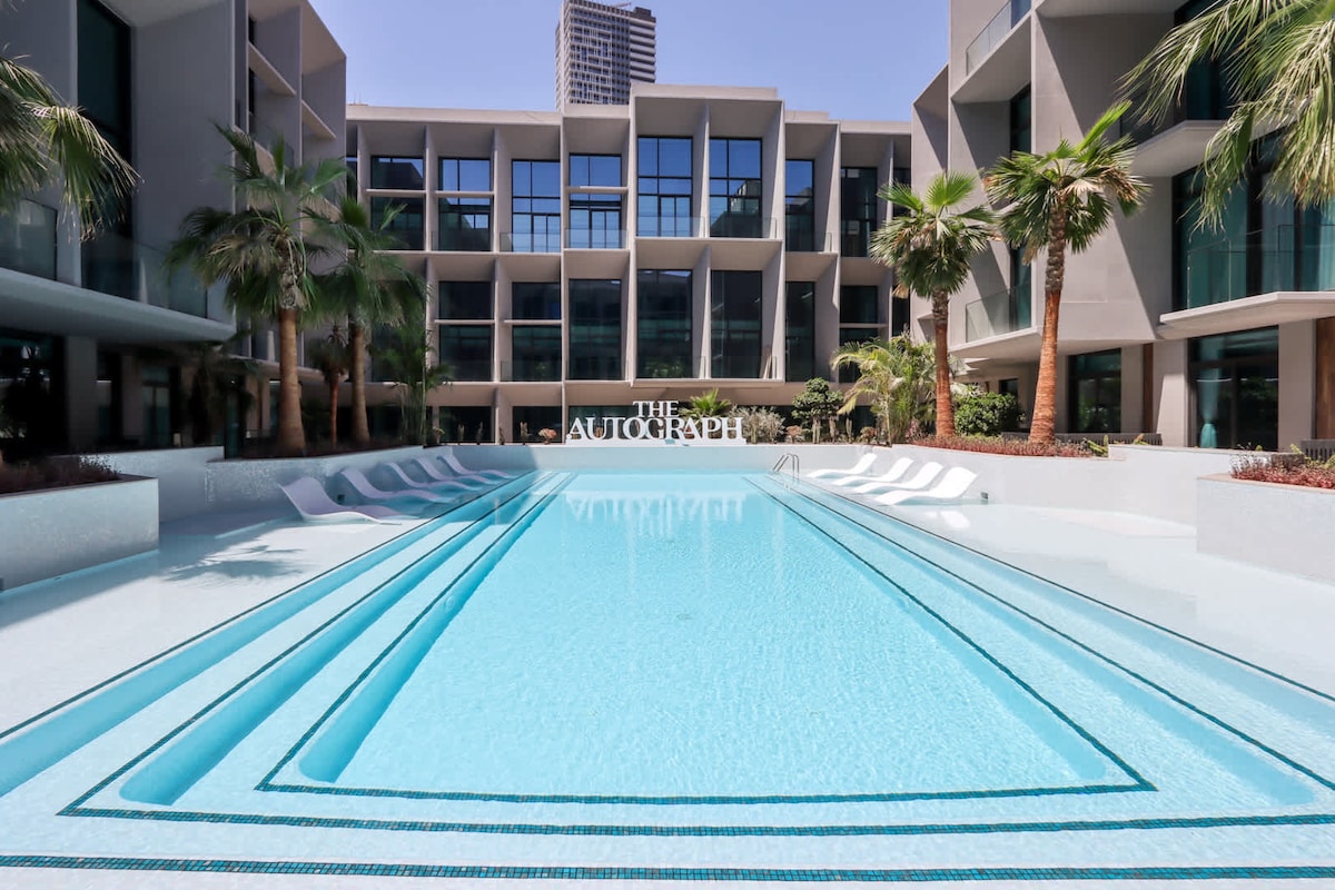 Experience a truly unique stay in this brand new 1BR apartment featuring your own private pool right on the balcony. The perfect blend of comfort and style. The apartment is furnished with carefully selected, high quality pieces to make you feel at home. Everything you need for a comfortable and convenient stay. Enjoy a dedicated, thoughtfully designed work area, making it ideal for business travelers and digital nomads.