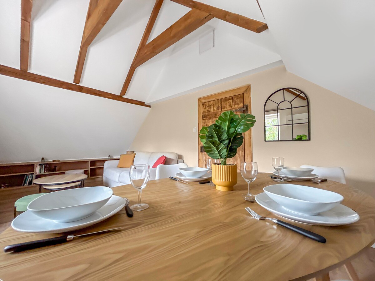 지붕 아래, 넓고 밝고 조용하며 독립적인 공간, 개성 있는 집 2층에 위치. 두 개의 큰 벨뤼스 창문을 통해 보주산맥의 멋진 전망을 감상할 수 있습니다. 임대 숙소에는 메인 룸, 더블 침대가 있는 침실, 욕실, 작은 주방, 다다미 위에 매트리스 2개가 놓인 중이층이 포함됩니다. 복원은 친환경 소재로... 그리고 많은 관심과 사랑으로 이루어졌습니다! 원하는 대로 정원을 이용하실 수 있습니다!