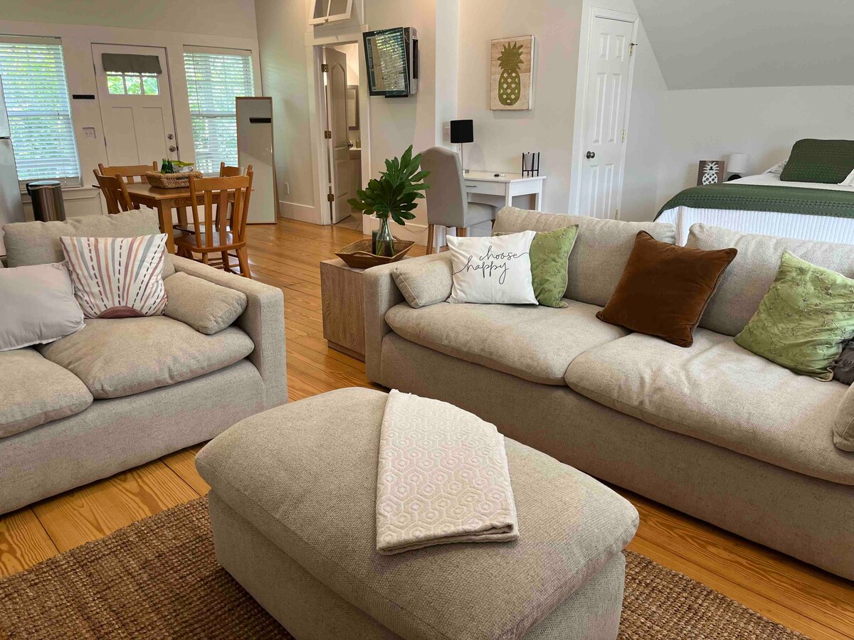 나무 꼭대기에 위치한 평화롭고 밝은 차고 아파트에서 집처럼 편안하게 쉬세요. 윌밍턴 최고의 지역 근처에 중심지에 위치하고 있습니다. 유서 깊은 시내까지 차로 10분, 라이트즈빌 해변까지 15분 거리입니다! 편안한 킹사이즈 침대, 넓은 거실에서 휴식을 취할 수 있는 공간, 요리에 필요한 모든 시설이 완비된 주방이 있습니다! 진입로 주차와 나무 위 숙박 시설이 완벽한 프라이버시를 보장하는 동안 공용 뒷마당 공간을 즐기세요. 내 집처럼 편안하게 지내세요!