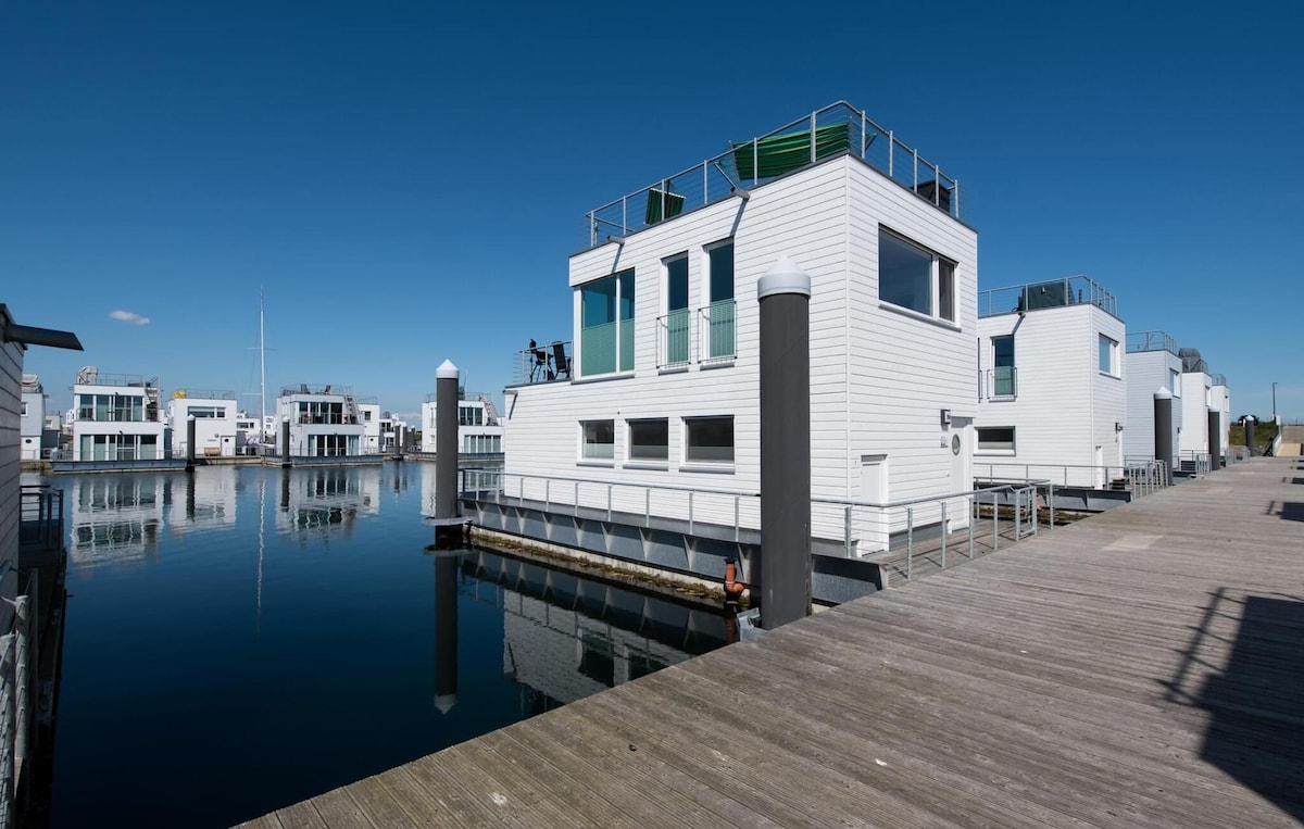 Floating holiday home on the Baltic Sea in Marina Olpenitz. This houseboat offers two bedrooms, a kitchen, three terraces, a barbecue, a sauna, a boat dock, a washing machine and much more. Enjoy a unique holiday experience at any time. Private parking included.