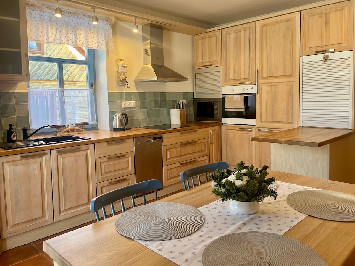 우리는 큰 정원과 연못이 있는 비전통적인 원형 초가집을 제공합니다. 비소치나 지역의 그림 같은 곳에 위치하고 있으며, 작은 마을 비스트라의 가장자리에 있습니다. 주변에는 흥미롭고 즐거운 것들이 가득합니다. 리프니체 나트 사자보우 성, 채석장, 숲, 초원, 강, 연못, 그리고 전설적인 멜레호프가 있습니다. 집은 작고, 완비되어 있으며 2인용으로 편안합니다. 낭만주의자와 옛 시절을 사랑하는 사람들이 좋아할 것입니다.