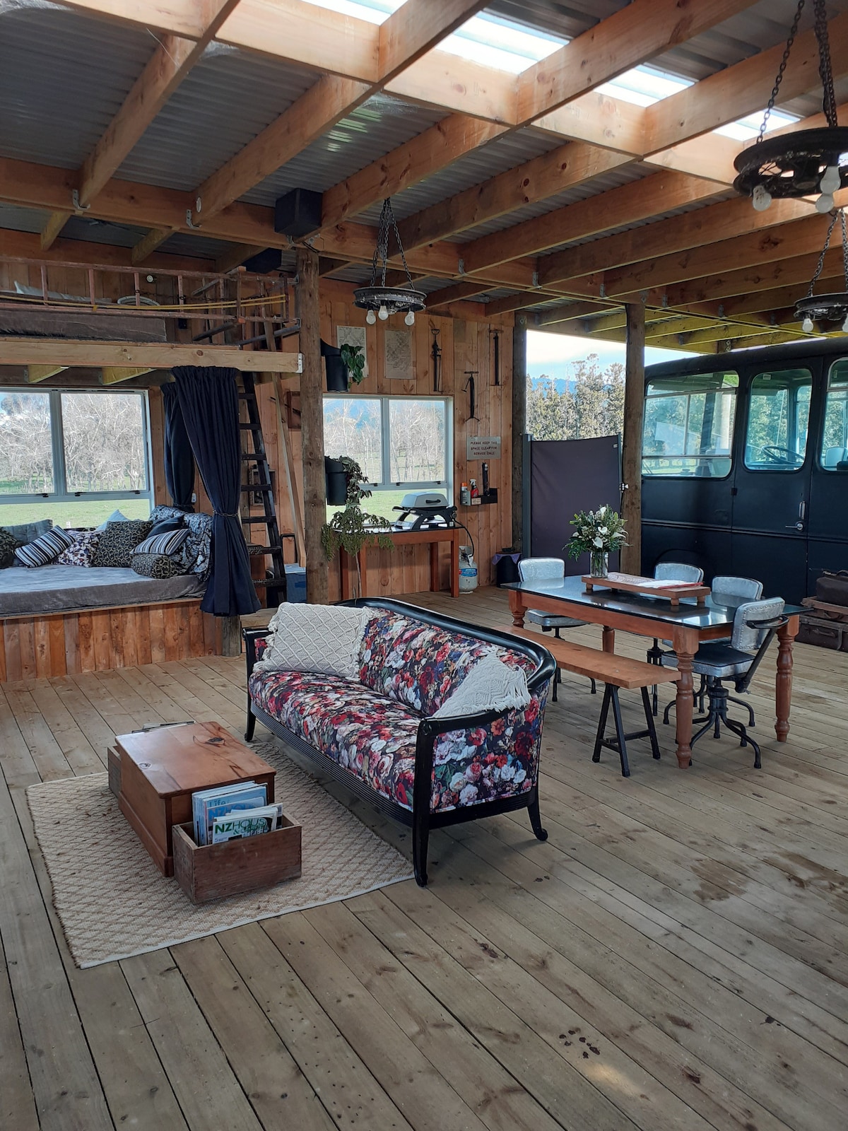 The Bus Depot is a rustic retreat overlooking the beautiful firth of Thames. A beautifully restored 1979 Bedford bus which has all the modern comforts but still retains original features of the bus, this area has sleeping for two along with kitchen area, fridge, gas stove and a dining area on the covered deck. From the daybed to the loft space or going for a walk on the farm or just sitting in front of the fire you can enjoy the views at this outstanding location.