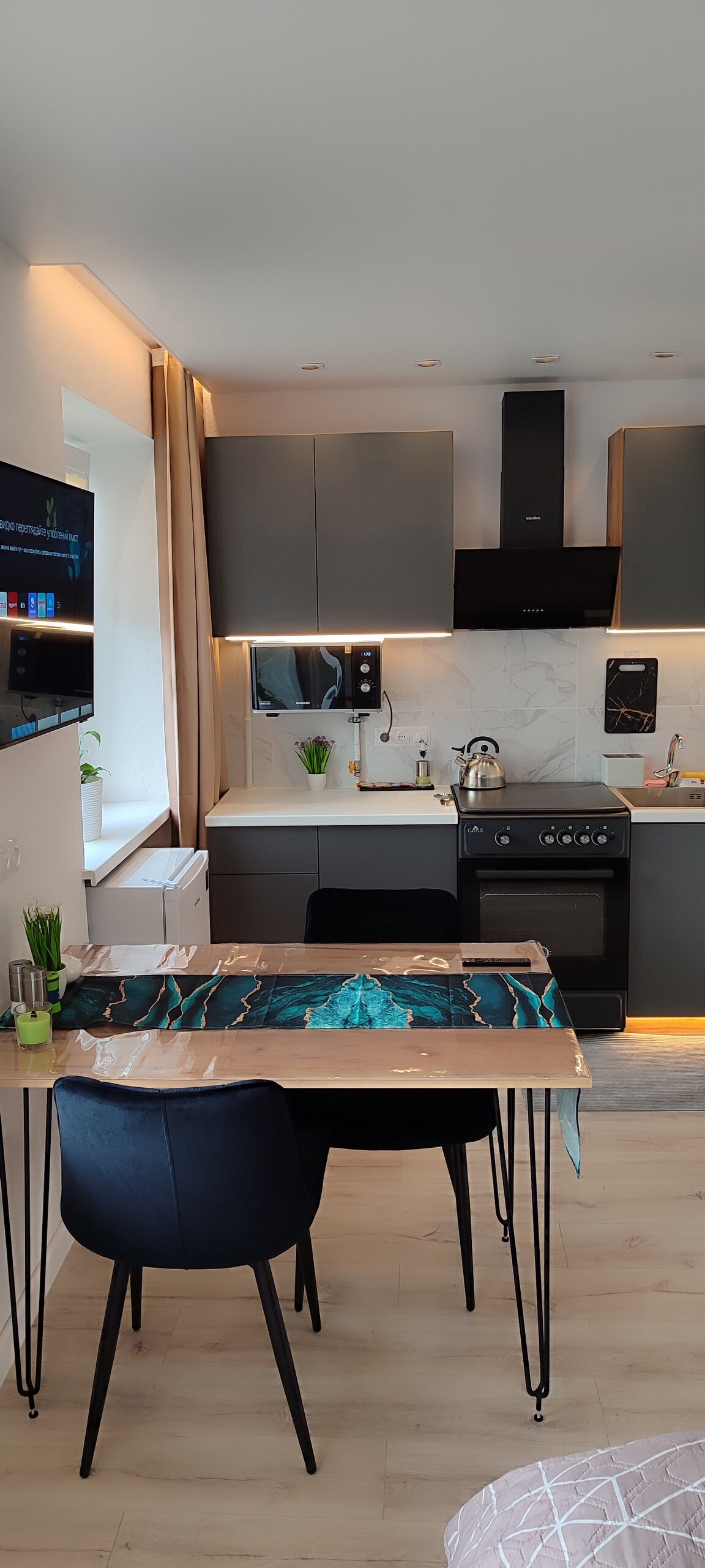 Це унікальне помешкання має власний стиль. Є барна стійка і вихід на відкритий балкон. Апартаменти облаштовані всією необхідною технікою: Smart TV, Wi:Fi, кондиціонер, пральна машина, фен, холодильник, мікрохвильовка, чайник, газова плита, духовка, посуда... Помешкання світле чисте і практичне! Будемо раді вашому перебуванні! Ласкаво просимо!