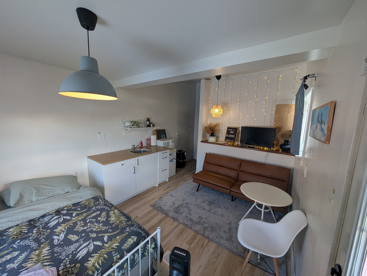 아늑한 지하 스튜디오에서 편안한 휴식을 즐기세요. 트베이의 완벽한 숙소입니다! 편안한 침대와 게으른 저녁을 위한 TV 공간, 업무가 필요한 경우 편리한 워크스테이션, 간단한 간식을 즐길 수 있는 간이 주방 등 필요한 모든 시설을 갖춘 개방형 공간입니다(참고: 싱크대가 없지만 필수품은 준비되어 있습니다!). 전용 욕실은 복도 바로 건너편에 있습니다. 공유할 필요가 없습니다.