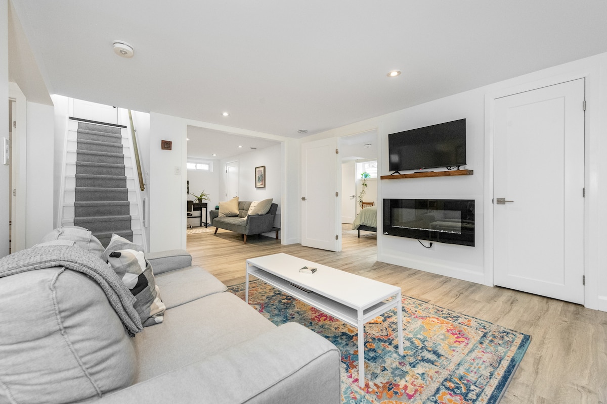 새로 지어진 지하 스튜디오 스위트에서 완벽한 휴가를 보내세요! 휴식과 기능성을 염두에 두고 설계된 매력적인 휴양지입니다. 저희 스튜디오는 완비된 욕실과 요리에 필요한 시설을 갖춘 간이 주방을 자랑합니다. 또한, 아름다운 벽난로 옆에 놓인 편안한 소파 베드가 있어 휴식을 취하기에 아늑한 분위기를 조성합니다. 러닝머신이 포함되어 있어 피트니스 루틴을 유지하기에 편리합니다.