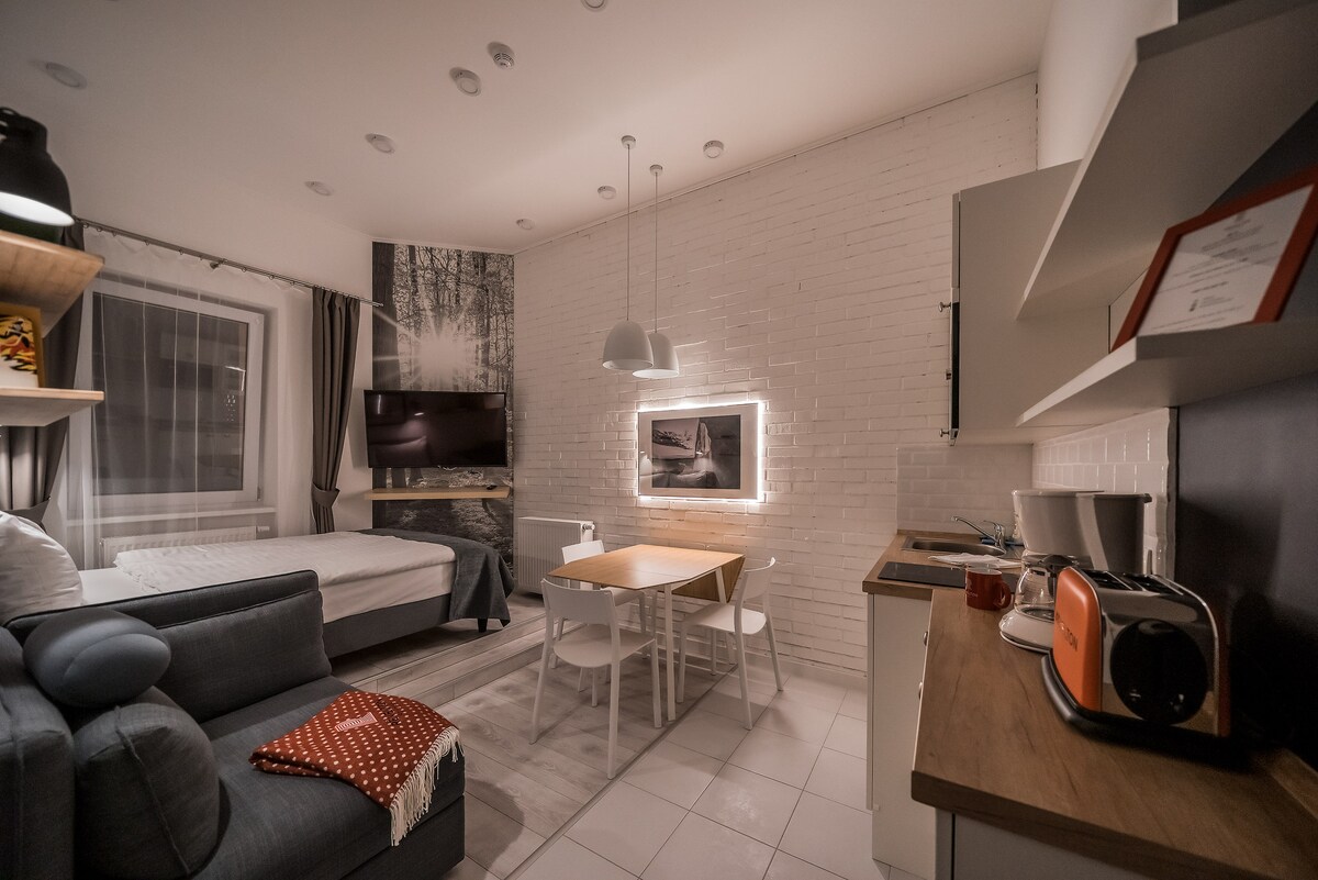 Our contactless aparthotel is located in the heart of the city and offers apartments with modern interiors, fully equipped kitchens and much more! We have a contactless check-in system. This means you will receive detailed instructions shortly before your arrival. Don't worry, we are always in touch via popular messengers and are ready to take care of you.