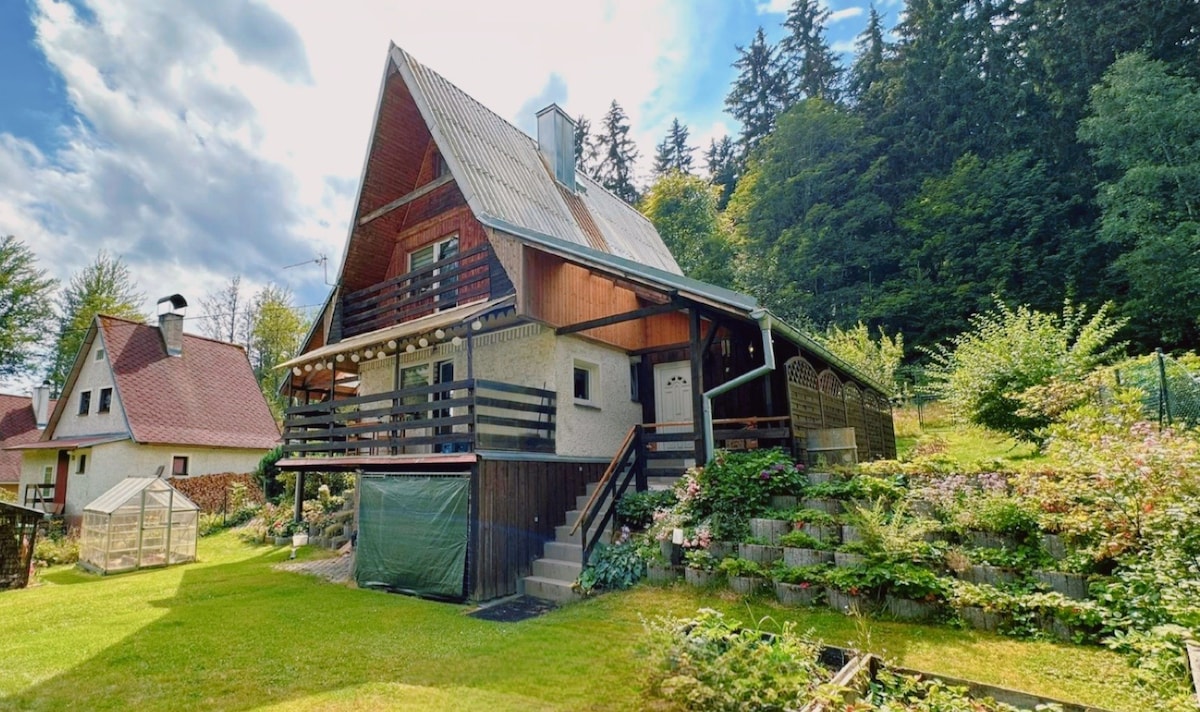 Horská chalupa nacházející se na krásném místě s výhledem na Krušné hory v těsné blízkosti SKI areálu Klínovec. Chalupa je ideální pro 6-8 osob, vyspí se ale i 10 hostů. Obývací pokoj s mohutným krbem. Hosté jsou ubytováni ve 2 podkrovních pokojích/3+4 osoby/ a jedním pokojem s WC v suterénu /3osoby/.Obývací pokoj je spojen s plně vybavenou kuchyní a k dispozici je i jídelna. U domu je finská sauna a finský sud, který se zatopen 6-8 hodin dle zručnosti a počasí.
