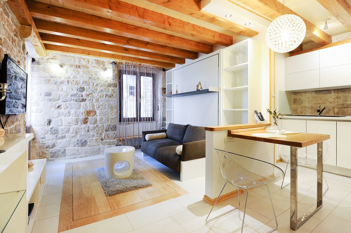 Unique and charming studio, located in the center of the old town of Trogir. Near the Trogir waterfront, boat lines, trips to the island, sightseeing opportunities.Our family restaurant/pizzeria offers our guests a 10% discount. Located in a safe area, the entrance is monitored by a camera,we live close and guarantee you a safe stay. We can provide you with parking in the City parking lot (at a reduced price). If you are interested in breakfast, send us a message.Thank you.