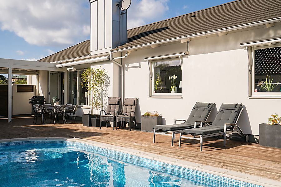 수영장과 야외 공간이 있는 세련된 현대적인 숙소.