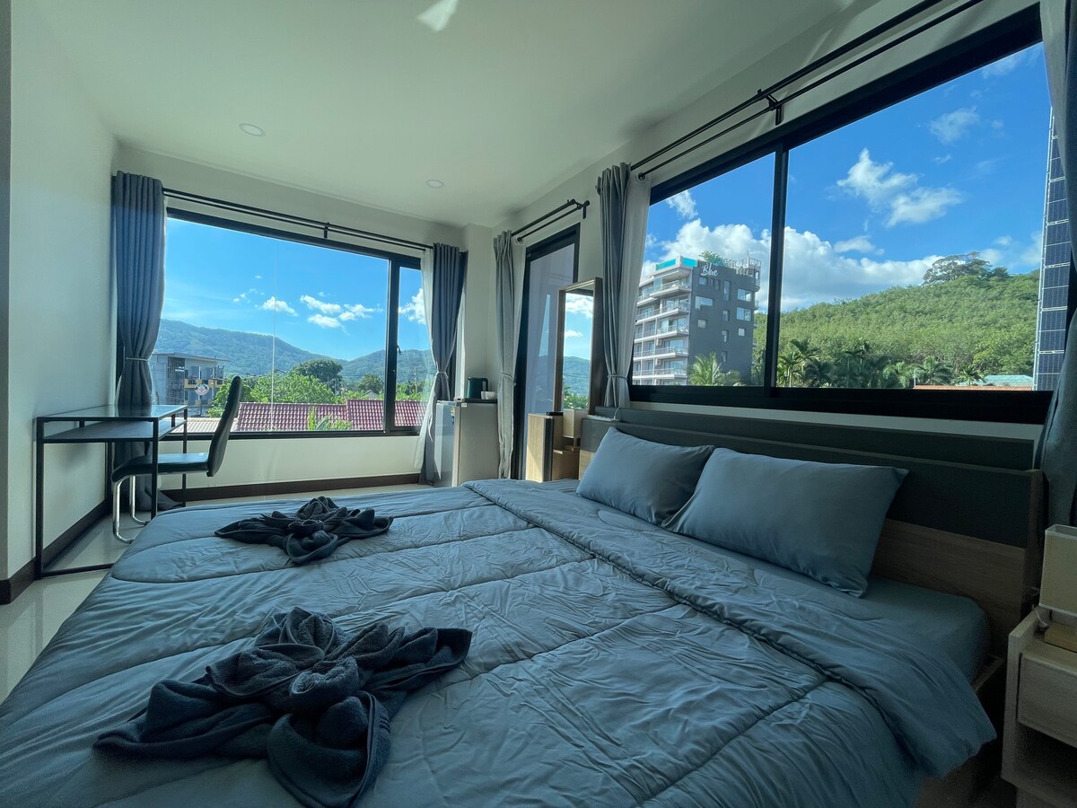 Studio on Soi Ta-iad (Fitness Street) in Chalong, Phuket, surrounded by gyms, cafes, restaurants, laundromats, and motorbike rentals. The space includes a king bed, fridge, TV, toilet, shower, and a small balcony. Enjoy street and mountain views from large open windows. Ideal for digital nomads, with a desk and high-speed fiber optic internet. Weekly cleaning provided, with electricity and water included. Perfect for fitness enthusiasts or travelers looking for a comfortable, convenient stay.