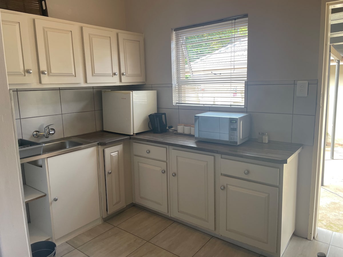 Studio apartment with kitchenette and Netflix, perfect for the corporate or leisure traveler. The apartment is meticulously cleaned and disinfected after each booking. Solar Power is provided for Lights, TV and high speed Fibre Wifi. Queen sized bed, with 400 thread count linen. The apartment is on the ground floor with communal gardens to enjoy. Coffee, Tea and sugars are available. The pool is available to be used by guests
