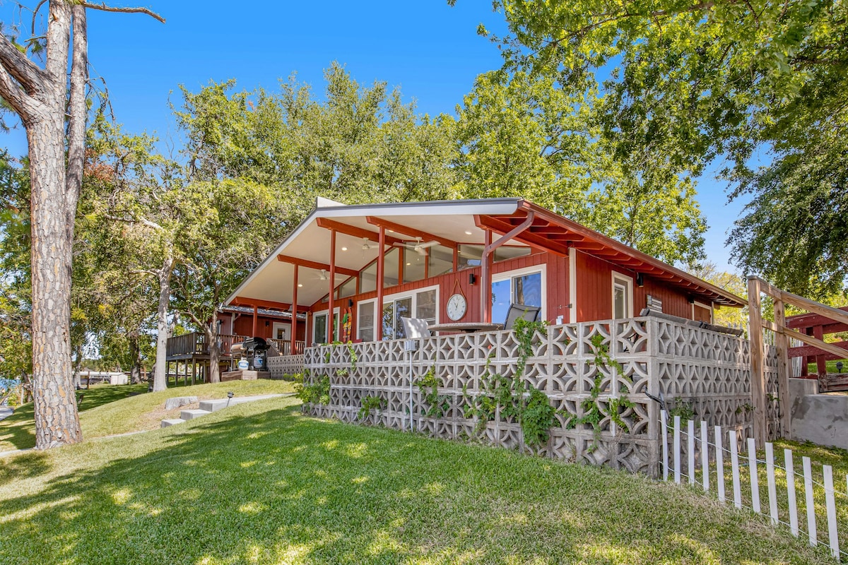 리모델링된 복고풍 현대식 60년대 호수 오두막에 있는 바닥에서 천장까지 이어지는 창문으로 레이크 LBJ의 리아노 강 팔의 멋진 전망을 즐기세요. 1132평방 피트의 거실 공간이 150피트의 호수 전면에 있습니다! 레이크 LBJ의 최고의 지역에 위치하고 있으며, 레이크 LBJ는 레벨이 일정한 호수로 모든 종류의 수상 스포츠에 적합합니다. 숙소에는 현대적인 전면 로딩 세탁기와 건조기가 있습니다. 보트 도크 부두에는 대부분의 보트나 PWC를 안전하게 고정할 수 있는 2쌍의 계류 장치가 있습니다. 이웃 보트 경사로는 두 문 건너편에 있어 선박을 쉽게 출발시키고 회수할 수 있습니다. 성인 사이즈 3개, 어린이 사이즈 1개, 카약, 모든 사이즈의 구명조끼, "릴리패드/프로그매트"가 제공됩니다. 자외선 차단제로 덮인 대형 뒤쪽 데크에는 바비큐 가스 그릴과 대형 블랙스톤 36인치 가스 그릴이 모두 있습니다. 넓은 뒷마당에는 천장형 선풍기가 있는 큰 그늘진 호숫가 '팔라파'(티키 오두막)가 있습니다. 집 앞에 자동차와 트레일러를 위한 주차장이 많습니다. 수상기구 대여 회사는 약 1분 거리에 있으며, HEB 식료품점은 5분 거리에 있습니다. 침실 1에는 킹사이즈 침대와 여행 가방 보관함이 있습니다. 2번 침실에는 퀸사이즈 침대와 2개의 이층 침대가 있습니다. 세탁기-건조기, 구명조끼, 여행용 가방을 수납할 수 있는 넉넉한 수납 공간이 있는 대형 옷장이 있습니다. 그레이트 룸에는 풀 사이즈 소파 침대 2개가 있습니다. 그레이트 룸에서 떨어진 곳에 있는 두 개의 욕실은 모두가 이용할 수 있습니다. 숙소의 최대 수용 인원은 8명입니다(성인 최대 6명 추천). 이 모든 것을 매우 깨끗하고 개방적이며 복고풍의 현대적인 컨셉 하우스에 결합하면 다음 휴가 임대를 쉽게 선택할 수 있습니다!