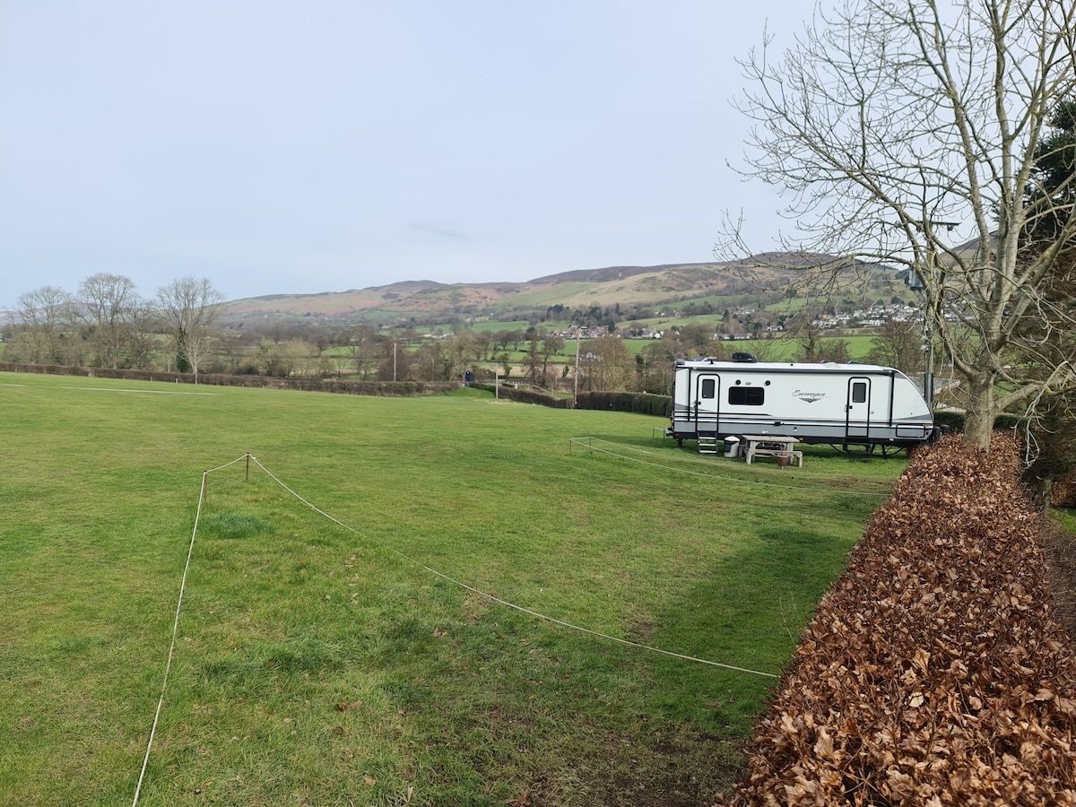 A perfect setting for a couple, family or group getaway, our American RV has everything that you need. From a comfortable bed, en-suite bathroom, fully equipped kitchen, lounge area and large screen TV. It enjoys views of the Clwydian Range which lye in an AONB with Offas Dyke running along them. Snowdon, beaches, Surf Snowdownia, Bounce below, Zip World, Portmeirion, GYG Karting, Llandudno ski, Gwrych Castle are all within easy drive