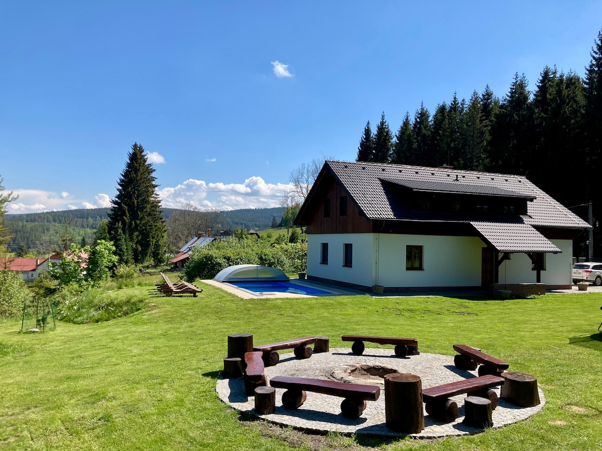 사우나가 있는 민감하게 개조된 전원주택은 Javornik na Šumavě에 있습니다. 개조된 전원주택에서 여유롭게 휴가를 보내기에 적합하지만, 자전거, 스키, 크로스컨트리 스키를 타고 활발한 휴가를 보내기에도 적합합니다. 많은 사이클링 트레일, 크로스컨트리 스키 트레일, 보헤미안 숲, 전망대, 산악 오두막을 따라 하이킹, 크로스컨트리 및 자전거 투어에 이상적인 자연 트레일이 있습니다.