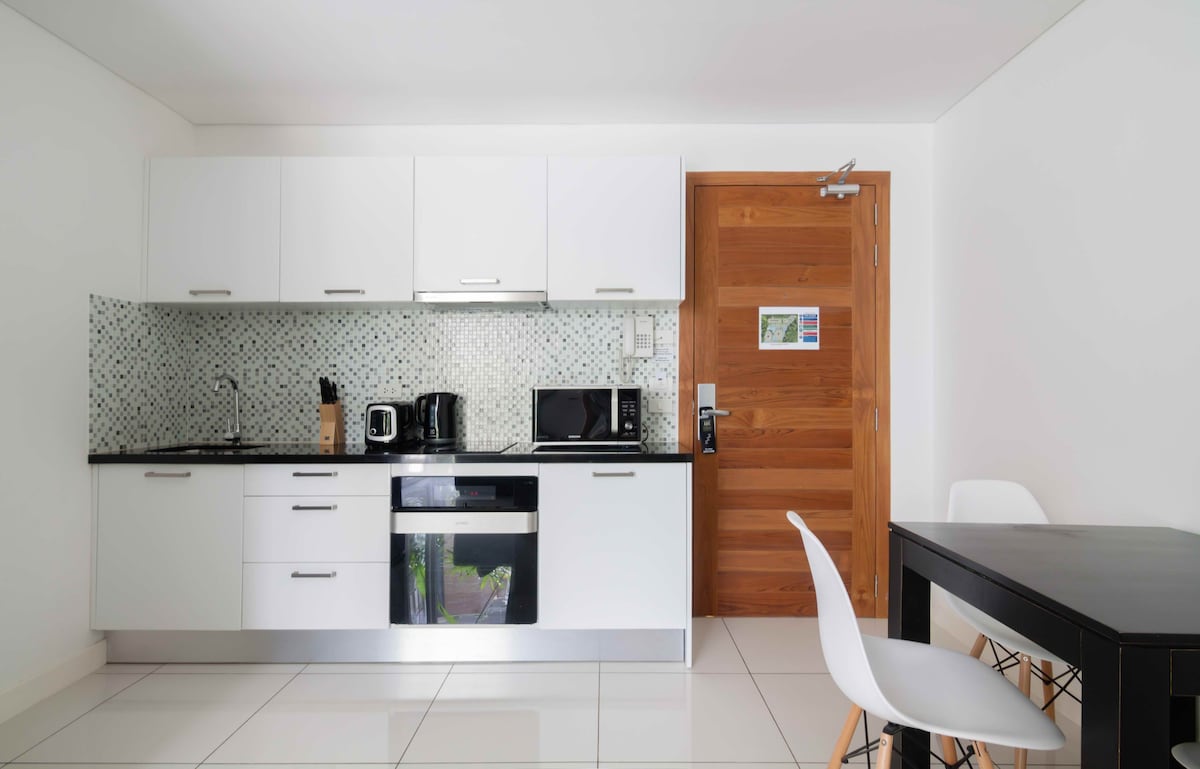 조용한 주택가에 위치한 콘도미니엄 단지 내 현대적인 2베드룸 아파트. 해변에서 불과 1.5km 거리에 있습니다. 아파트는 1층에 있으며, 공용 수영장 바로 옆에 위치해 있어 수영장으로 바로 이동할 수 있습니다. 수영장 옆에서 평화로운 분위기와 아침 커피를 즐겨보세요. 세탁기가 있는 주방 시설✔ 완비 ✔ 고속 광섬유 와이파이 ✔ 공용 옥상 헬스장 건물 내 ✔ 엘리베이터 거동이 불편한 게스트를 위한✔ 접근성 편의 ✔ 인증된 정수 시스템을 통한 깨끗한 식수