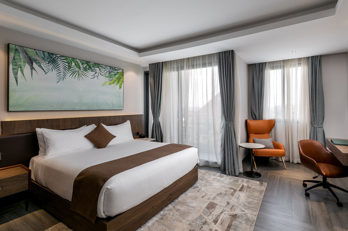 세련되고 고급스러운 숙소의 매력을 느껴보세요. 넓은 디럭스 룸에는 고급 및 출장자가 요구하는 모든 편의시설이 갖춰져 있습니다. 전용 욕실, 프리미엄 침구, 평면 TV 스크린, B&B, 무료 와이파이, 24시간 룸서비스, 무료 주차 공간, 24시간 보안, 9x15.4fts의 공간 크기