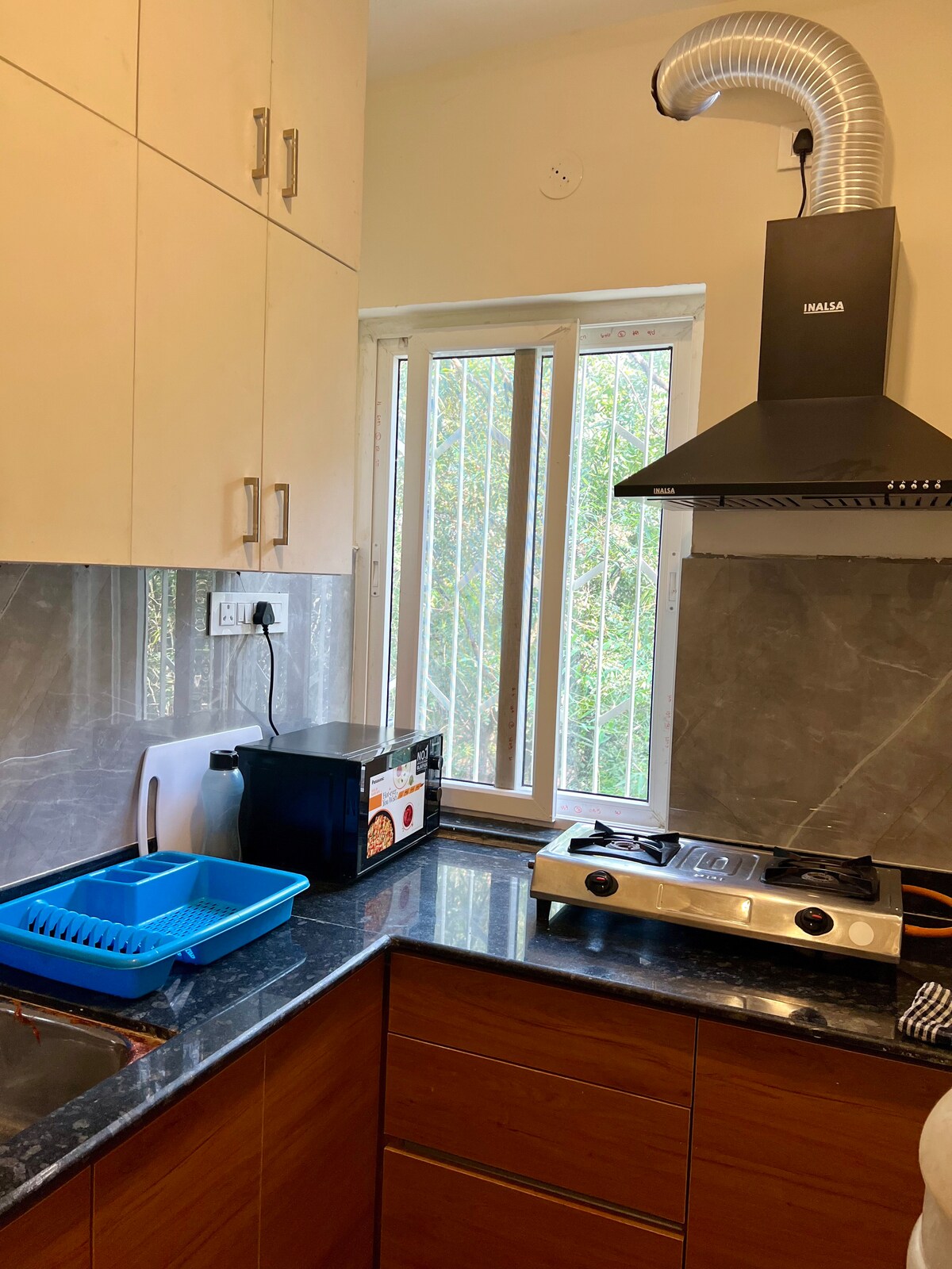 Enjoy this 2 Bedroom, 2 Bathroom cozy unit in a very convenient location in Telecom Nagar. An easy 5 minute commute to offices in Hitec City and Financial District. A short walk from the main road but still very quiet and peaceful. Every care has been taken to ensure this unit has everything you need to make your stay feel like home. There is high speed internet and the Google TV is hooked up to Prime and ZEE5 already. The beds are very comfortable, with high end mattresses.