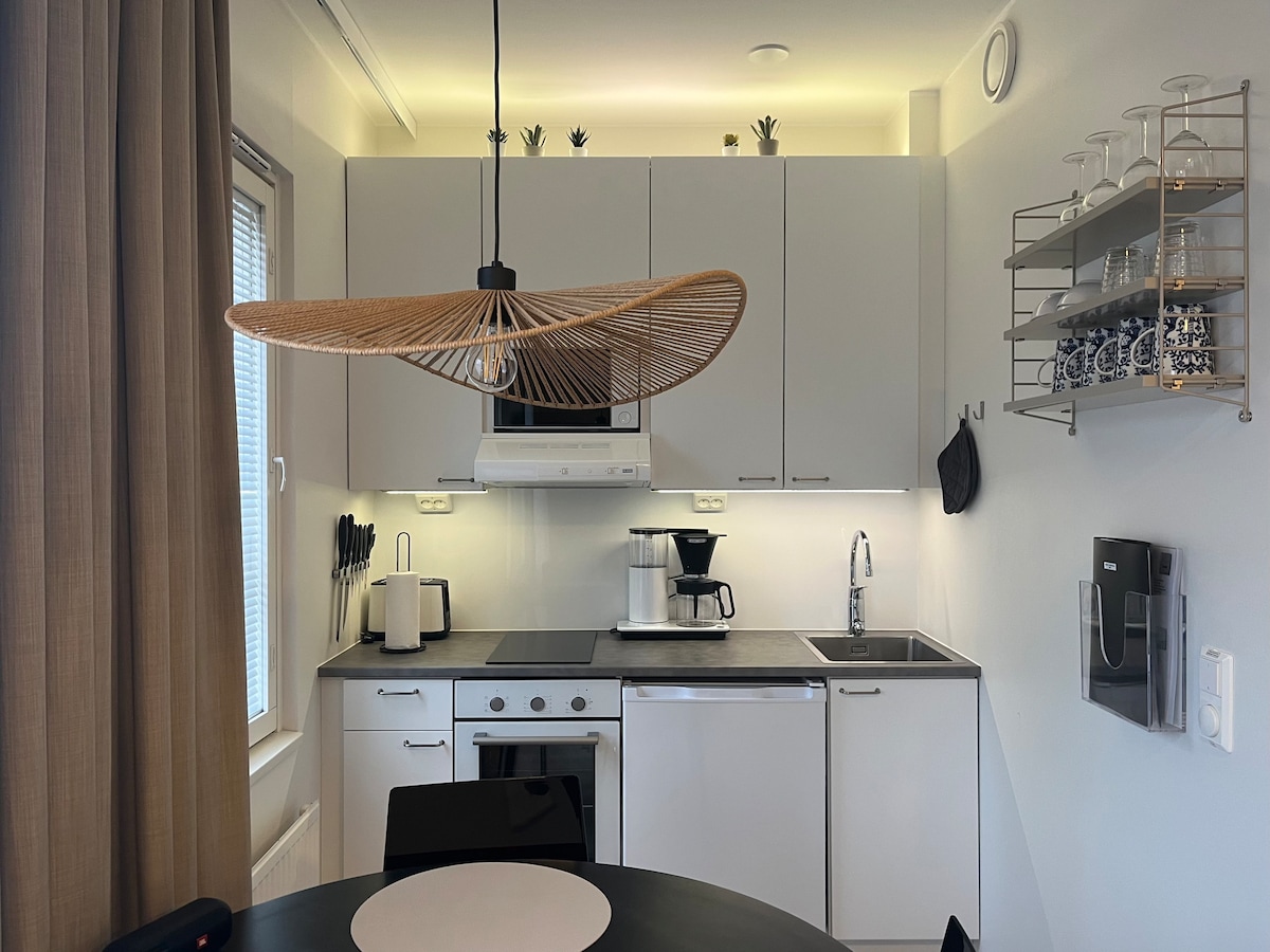 Nauti virkistävästä majoittumisesta tässä viihtyisässä, tyylikkäässä ja hyvin varustellussa kaksiossa, jossa on parveke ja sauna. Keskustan palvelut ja juna-asema 10 min kävelymatkan päässä. Upeat merenrannan kävely- ja lenkkeilyreitit alkavat talon läeisyydestä. Kaksi hiekkapohjaista uimarantaa 1 km käveyn päässä. Keskeismpiin museoihin ja kirjastoon kävelet 5-10 minuutissa. Åbo Akademi, Vaasan yliopisto ja Svenska handelsöskolan kävelyetäisyydellä. Urbaani ja luontoelämä kohtaavat täällä.