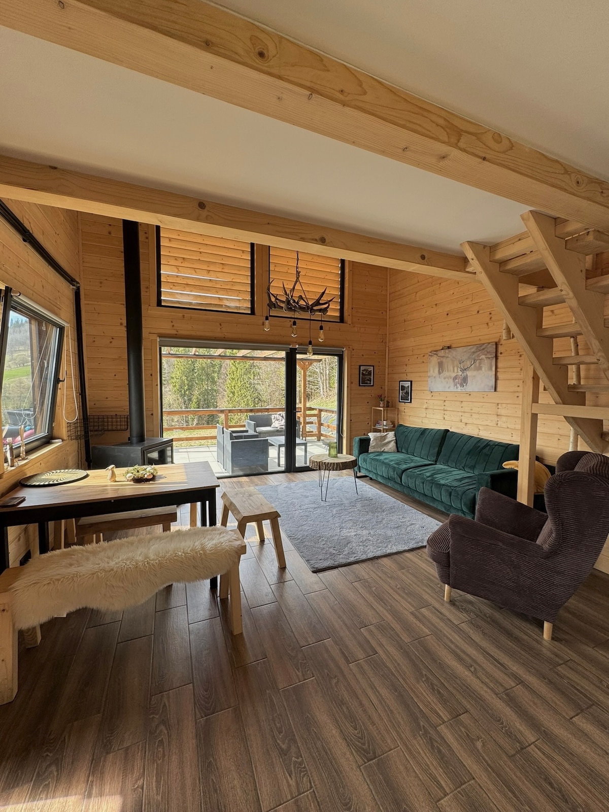 Domek jest dwupoziomowy i jest w stanie pomieścić 8 osób.Parter składa się z salonu z kominkiem,w pełni wyposażoną kuchnią oraz łazienkę.Piętro obejmuje 2 sypialnie,łazienkę oraz taras.W całym domku można korzystać z internetu. zewnątrz jest miejsce gdzie mozna zapalić grilla,plac zabaw .Do dyspozycji gości jest również jacuzzi( na wyłączność) oraz sauna współdzielona
