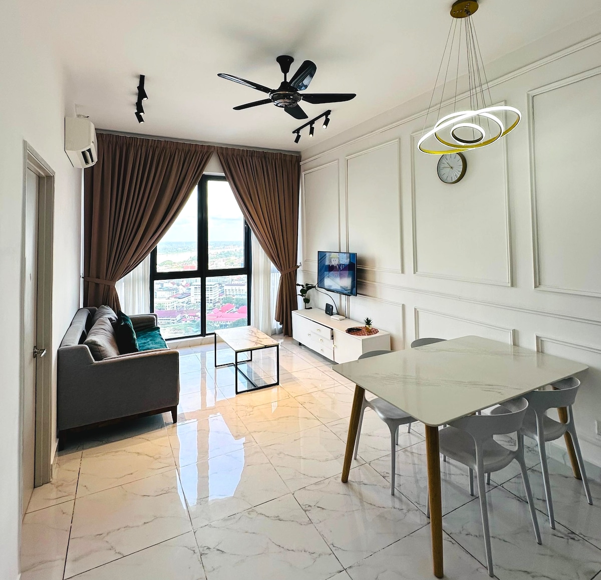 Scenic river facing 3-bedroom apartment with amazing view of Sungai Kelantan, right within the buzz of Kota Bharu town - with friendly host just a call away. A 886ft2 apartment unit with 24-hr security and ample parking spaces. 3 bedrooms, 2 attached baths, and comes with air-conditioning for living room, master bedroom, bedroom 2, and bedroom 3. Free Wi-fi with MyTV for your entertainment (or work). Right in the middle of historical Kota Bharu with superb accessibility.