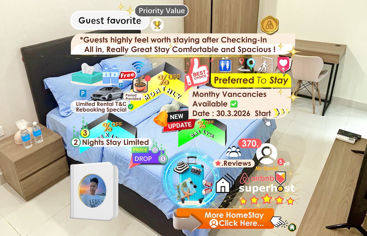 저희 홈스테이는 공항, 버스 터미널, 쇼핑몰 및 주요 관광지 근처의 매우 전략적인 위치(불러바르 쇼핑몰)에 있습니다. 따라서 저희 홈스테이는 출장자, 커플, 친구 및 가족과 함께 여행하기에 적합합니다. 게스트는 수영장, 헬스장, 사우나, 스팀 욕조, 쇼핑 및 식당을 이용할 수 있습니다. 즐거운 여행을 하시고 홈스테이에 머물면서 동시에 쿠칭의 필수 관광지인 사라왁 문화 마을 등을 둘러보세요.