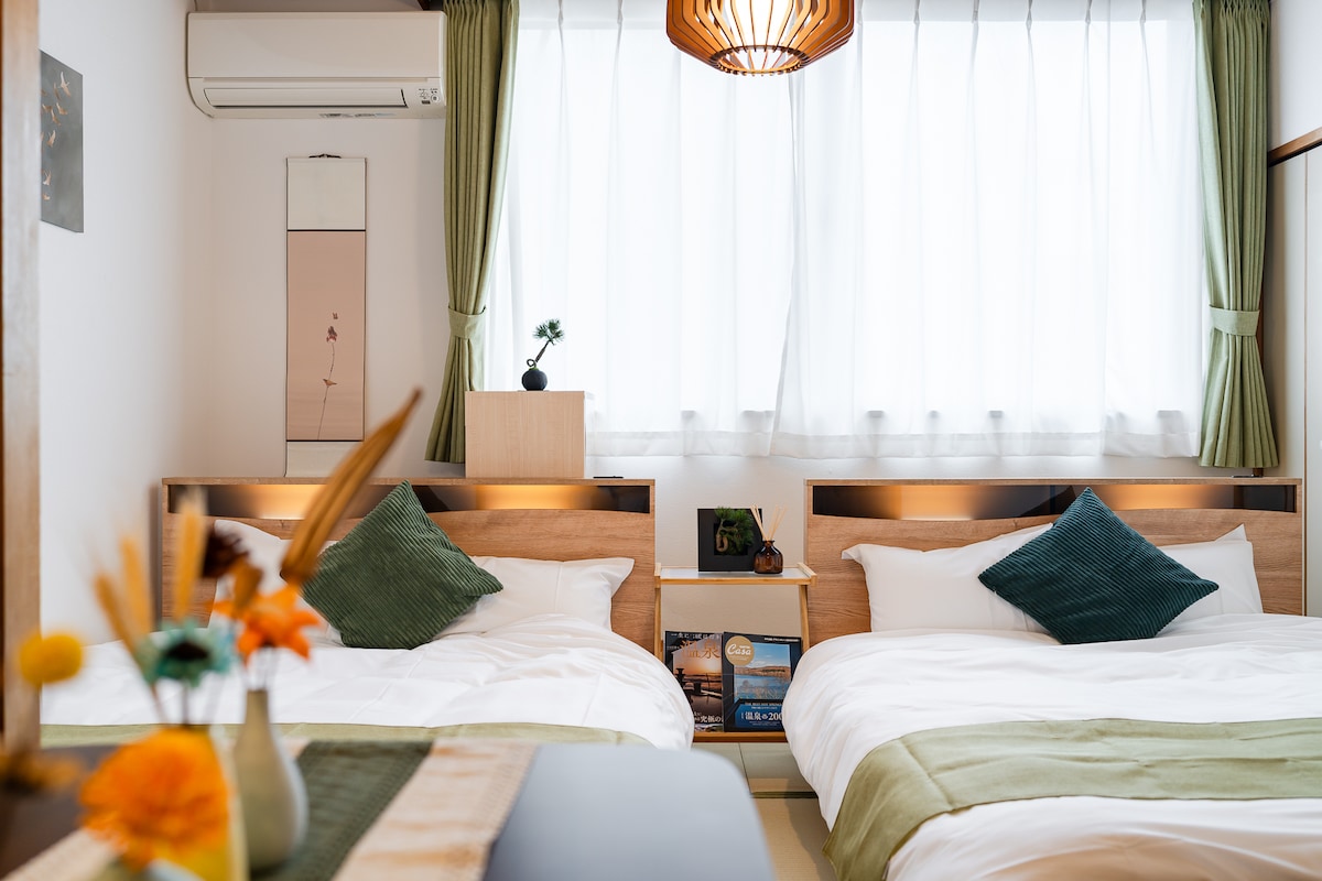 이 숙소는 가족이나 친구들과 중장기 숙박을 즐기기에 적합한 장소입니다. 도심에서 가까운 조용한 주택가에 위치한 2023년 오픈한 아파트 호텔입니다. 주변에는 수변, 공원, 신사가 있습니다. 35㎡의 넓은 실내는 일본식 디자인입니다. 퀸사이즈 침대 1개, 이불 3개가 있어 성인 5명까지 숙박할 수 있습니다. (2세 미만 유아의 동반 잠자리는 무료입니다.) 직접 요리할 수 있는 소형 주방, 전자동 세탁 건조기, 넓은 크기의 욕실, 별도의 화장실이 있습니다. 안드로이드 TV와 무료 와이파이 환경도 갖추고 있어 실내에서 머물거나 일할 수 있는 충분한 환경입니다. 게스트에게 개방된 루프탑에서 휴식을 취할 수도 있습니다. 체크인은 태블릿을 사용하는 무인 체크인 시스템이므로 심야에도 신경 쓰지 않아도 됩니다. 도어는 최신식 터치키 시스템으로 관리됩니다. 가장 가까운 역(주지역, 반조문선, 도에이 신주쿠선) 출구에서 도보로 5분 거리에 있으며, 근처에 슈퍼마켓 등이 있습니다. 이 차분한 숙소에서 가족과 함께 휴식을 취해 보세요.