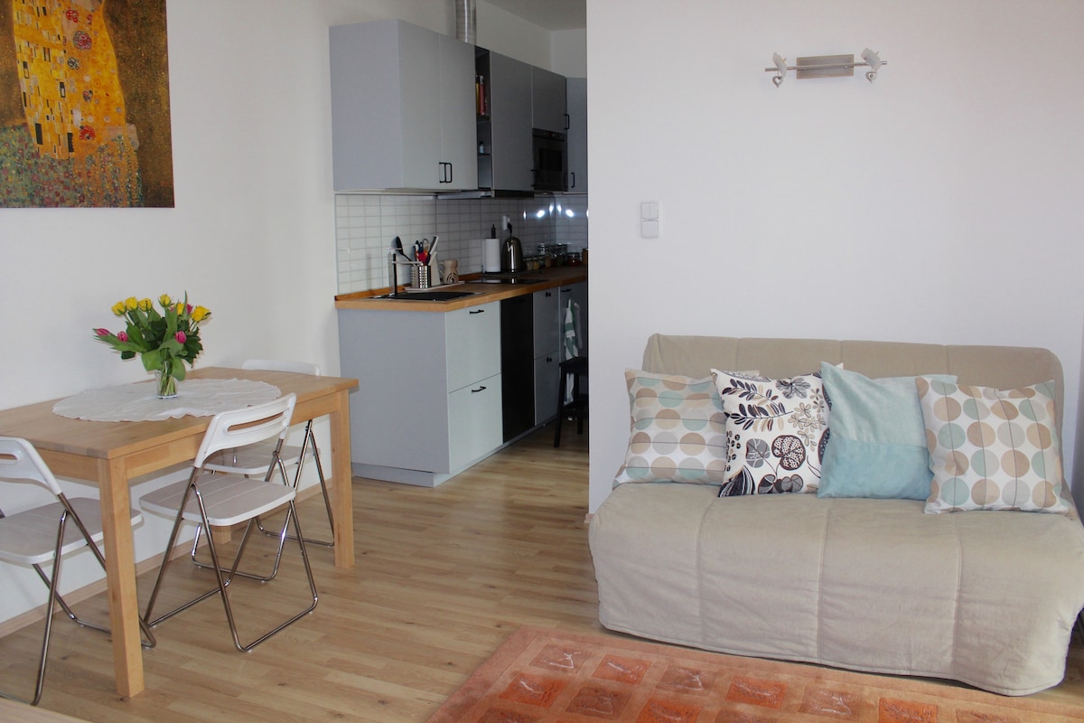 이 스튜디오는 2019년에 리노베이션되었습니다. 저녁에는 늦은 태양이 오면 조용한 마당을 즐길 수 있습니다. 욕실에서는 마록의 시멘트 타일을 볼 수 있으며 침대는 편안한 대형 매트리스와 여분의 크기의 담요로 저희 손으로 합니다. 거대한 공공 차고, 트램 정류장, 상점, 레스토랑, 카페, 공원, 박물관 등 필요한 모든 것이 매우 가깝기 때문에 플랫의 위치는 여러분의 숙박에 완벽합니다. 구시가지나 성까지 공원을 걸어다닐 수 있습니다.