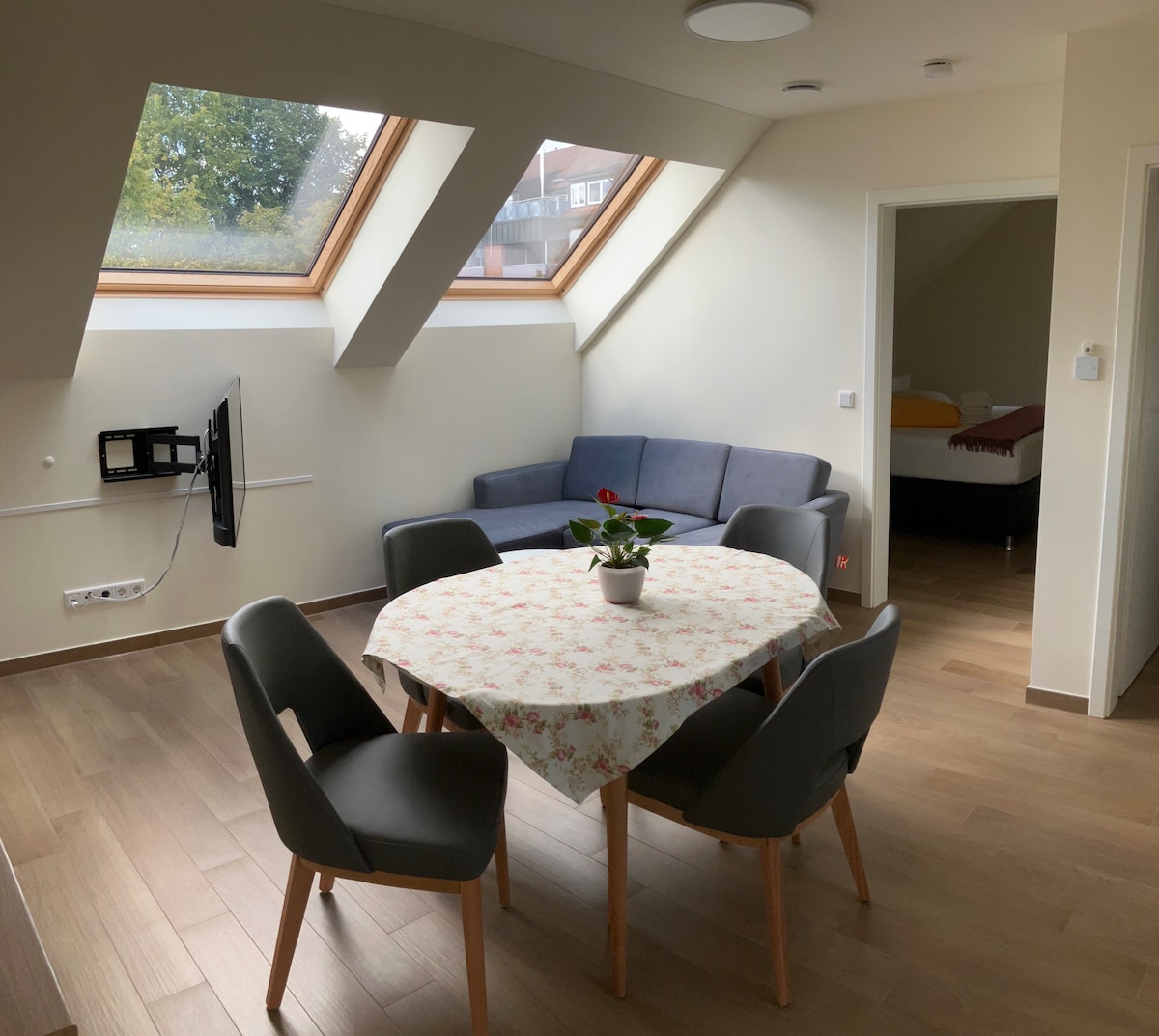 Entspanne dich in dieser friedlichen Unterkunft. Insgesamt 48 Quadratmeter. Hat einen Doppelbett für zwei Personen und einen Schlaf Sofa aufklappbar auch für zwei Personen. Küche und WC mit Dusche. Wohnung befindet sich im Erdgeschoss. Leckere und bekannte Bäckerei gleich neben an.😋 Bushaltestelle gleich in der Nähe.