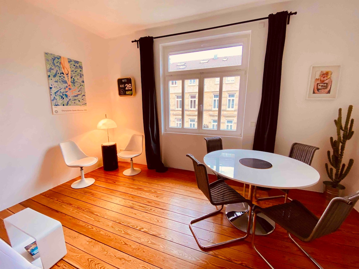 The apartment is centrally located, in the urban Stuttgart-West. Our historic apartment is located on the 3rd floor of a early 20th-century Gründerzeit house. It is furnished in modern retro charms of the 60s and 70s. From the farmers market to the in-bar, everything is right around the corner, including public transport. Feel at home here!