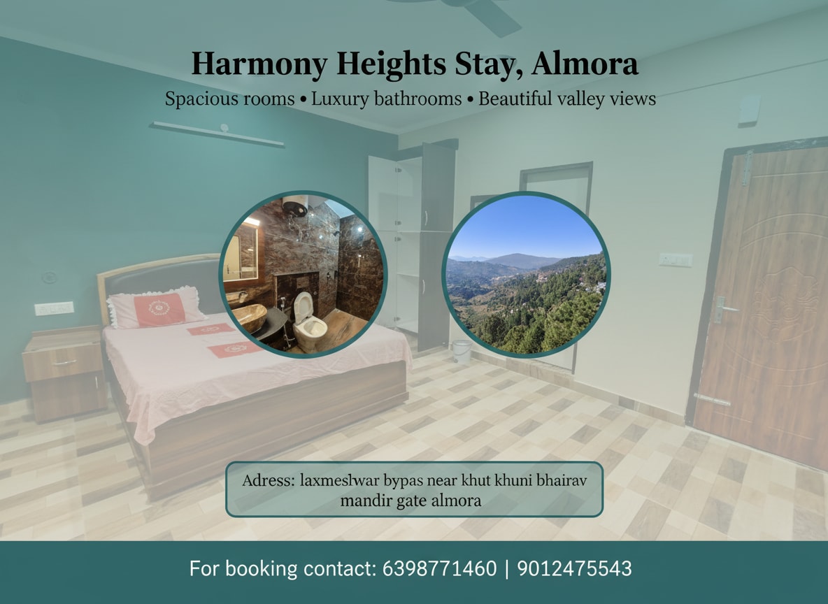 Nestled in the serene hills of Uttarakhand, Harmony Heights Stay in Almora offers a peaceful mountain retreat for families and solo travelers alike. Known for its breathtaking panoramic valley views, this stay perfectly balances modern comfort with the tranquil beauty of nature. Accommodation & Amenities The property features spacious kingsized rooms designed with a clean, contemporary aesthetic. Each room is equipped with Modern Bathrooms: High-end finishes and hot showers for a luxury feel