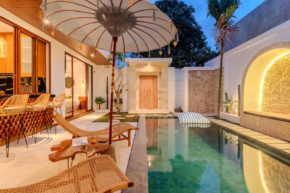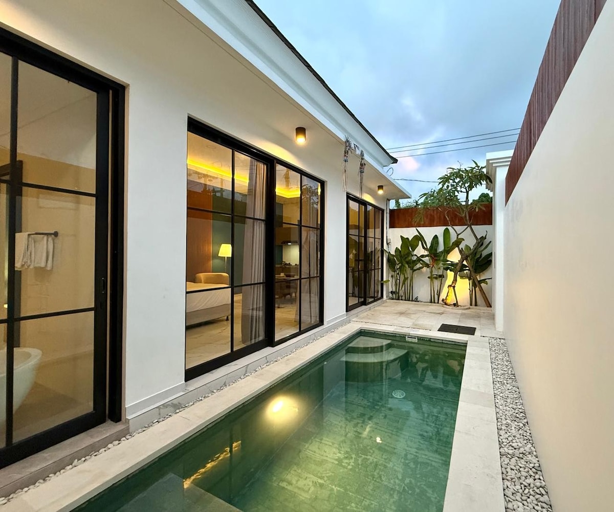 Enjoy your romantic private times in a luxurious complex, close to a fine selection of world-class cafes, restaurants and beach clubs. But perfectly hidden in a serene and quiet villa neighbourhood. This villa features an ensuite bathtub and offers a perfect dip-in pool. Enjoy your floating breakfast under the wood panels with sunlight gently pouring through. Chillax on the bean bag or sun loungers at your choice while soaking up the view of the garden.