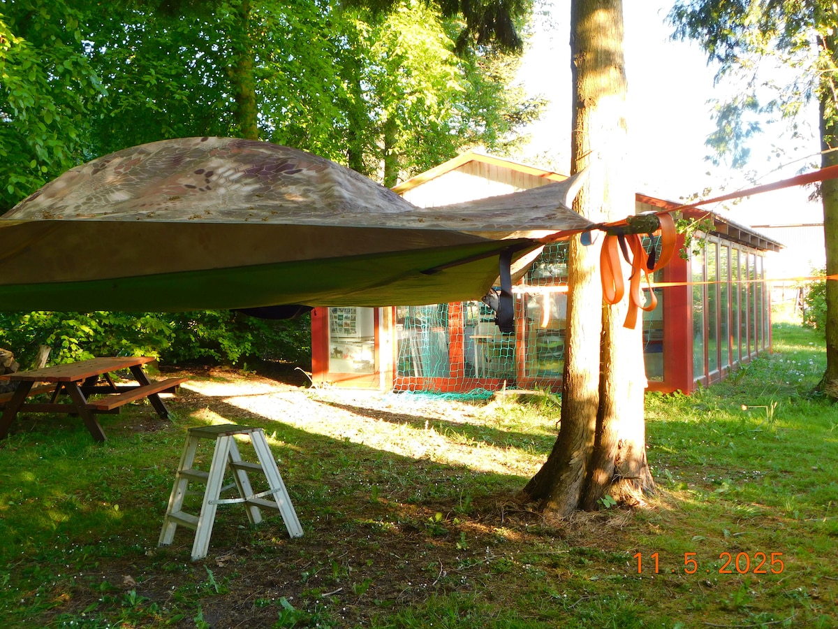 Fredelig og privat i baghaven ved landejendom. Udsigt over heste og kreatur folde, med mulighed for tæt kontakt til dyr og natur. Overnatning for 2 personer i dobbeltseng i hytten. Fra 1. maj, mod merbetaling 150 DKK, desuden mulighed for 2 personer i Stingray telt udspændt mellem store træer ved siden af hytten. Spiseplads for 2 i hytten. Om sommeren ved 4 gæster er der spiseplads udendørs eller i orangeri 10 m fra hytten.