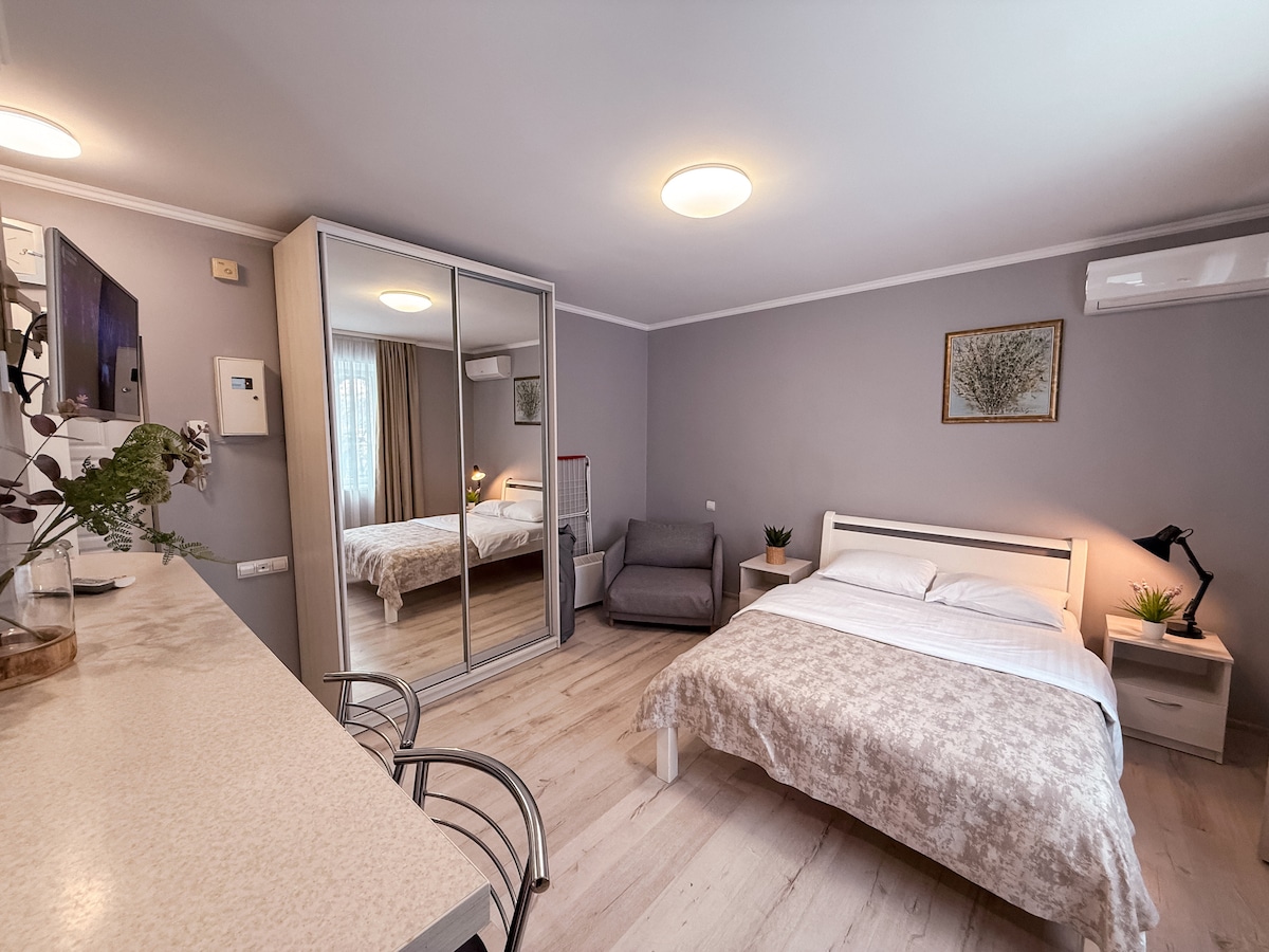 A cozy and modern studio in white and light gray tones on the 2nd floor. The building is located in the center of Kyiv near the shopping center "Gulliver", not far from the Olympic Stadium and Khreshchatyk Street, a 5-minute walk from the “Palace of Sports” metro station. The apartment has a queen-size bed and, if it is necessary, an additional fold-out bed. The studio has a small kitchen, bathroom and toilet with everything you need, smart TV and Internet.
