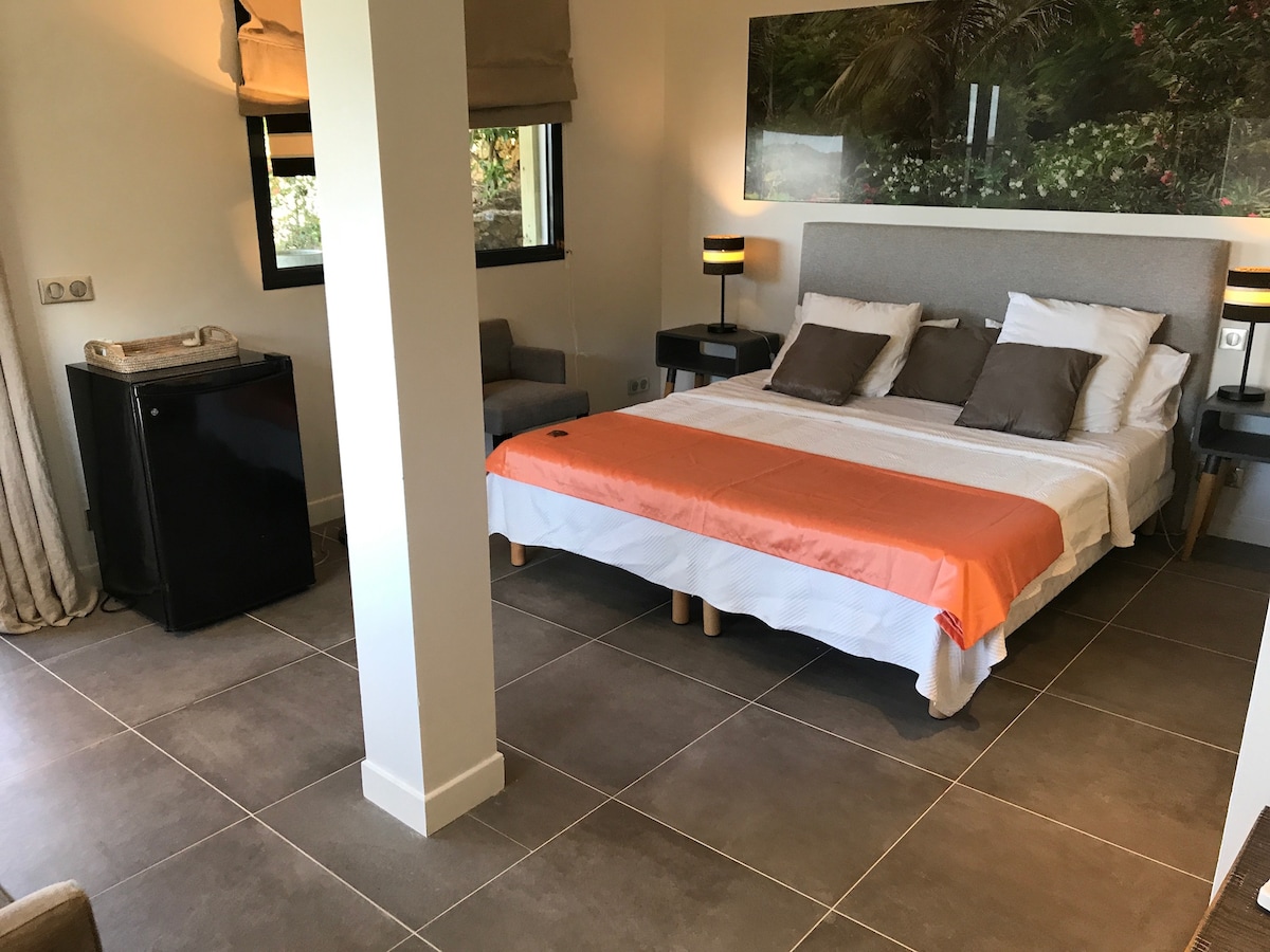 카리브의 진주, 생바르텔르니. 조용하고 친환경적이며 건강한 장소에서 여러분을 맞이하게 되어 기쁩니다. 저희의 목표는 예를 들어 광섬유 와이파이와 같은 현대적인 감각을 더해 단순함과 고급스러움을 연결하는 것입니다. 환경, 섬의 역사, 그리고 숙박객의 전반적인 복지를 존중하는 곳입니다. 3400m2의 부지에 위치한 55m2의 거실 공간과 15m2의 테라스를 갖춘 독립적인 방갈로로 울창한 열대 정원에 있습니다.