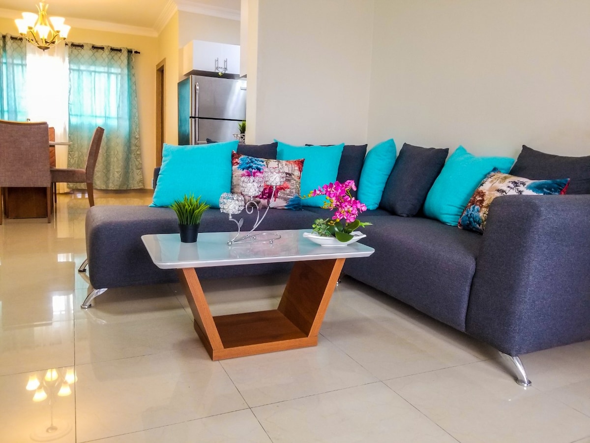 조용하고 안전한 주택가에 위치한 별도의 출입구가 있는 연립주택. 라스 아메리카스 국제공항에서 8분, 보카 치카 해변에서 10분, 산토 도밍고에서 20분 거리에 있습니다. 에어컨이 설치된 침실 3개와 욕실 2개. 온수, 와이파이, 아마존 프라임 TV가 갖춰져 있습니다. 스마트 TV 3개, 거실에 1개, 침실에 2개. 차량 2대용 주차장. 작은 안뜰과 세탁실.