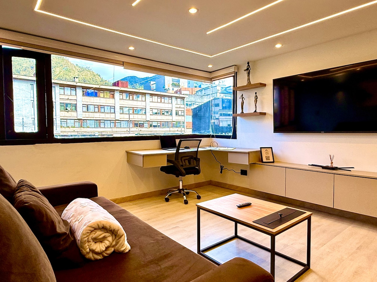 보고타 중심지의 휴양지에 오신 것을🌟 환영합니다! 🌆 시내 최고의 관광지에서 몇 걸음 거리에 있는 아늑한 아파트로 휴식을 취하거나 일하거나 도시를 둘러보기에 안성맞춤입니다. 편안한 침실 2개, TV와 업무용 책상이 있는 거실, 조식 바가 있는 시설이 완비된 주방, 현대적인 욕실을 즐겨보세요. 전망이 좋은 옥상 테라스, 공동 작업 공간, 세탁실, 헬스장 등 놀라운 공용 공간도 이용하실 수 있습니다. 🏡 오늘 예약하기: 현지인처럼 보고타를 경험해보세요!