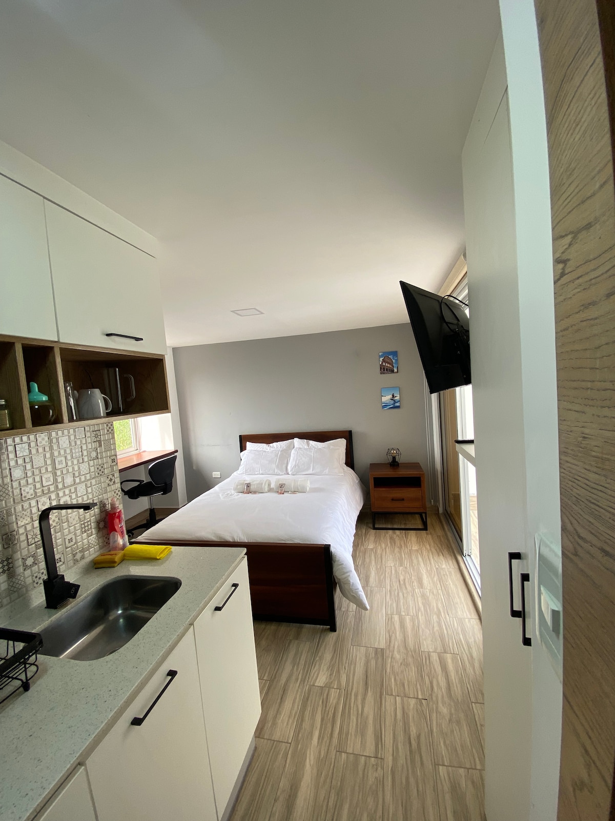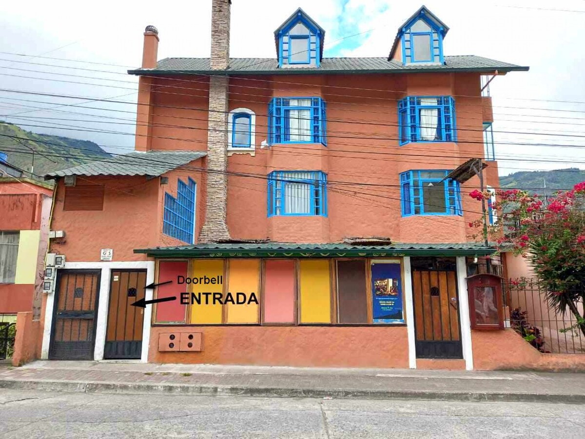 This quiet, comfortable suite is right in the center of Baños. The Wi-Fi is fast, the shower is hot, and both work even during power outages. There is lots of natural light with 3 windows, including a bay window with a large desk overlooking an inner courtyard. There's also a fully equipped kitchenette, a table and chairs, a comfortable double bed and a private bathroom. It's the perfect place to relax or get some work done. Small pets are allowed. No smoking, please.
