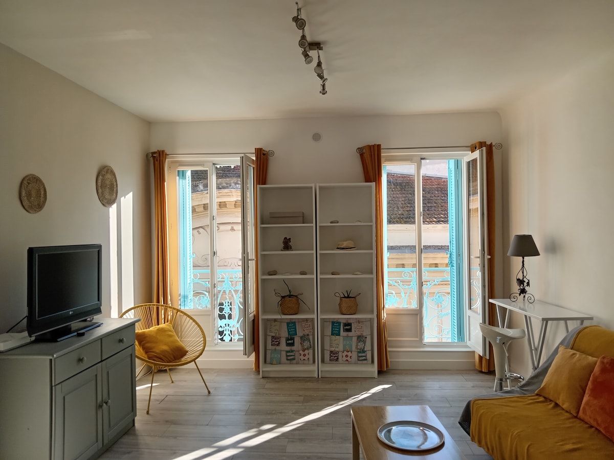 엘리베이터가 있는 신축 레지던스 2층에 위치한 38 ㎡ 의 아름답고 완비된 에어컨 T2입니다. 평점 3점 ⭐️ 전용 주차장. 해변과 모든 편의시설에서 5분. 기차역 및 도심 근처. 가까운 완만한 차선 (도시 전체를 관통하는 보행자 도로). 건물 아래에서 버스 정류장을 이용할 수 있습니다. 킹사이즈 침대 160x200 세탁기가 있는 욕실 주방 시설 완비, 센세오 커피 메이커... 고정 소파 139cm TV 2대 ⛔️바베큐 반입 금지⛔️ 🚫금연🚫