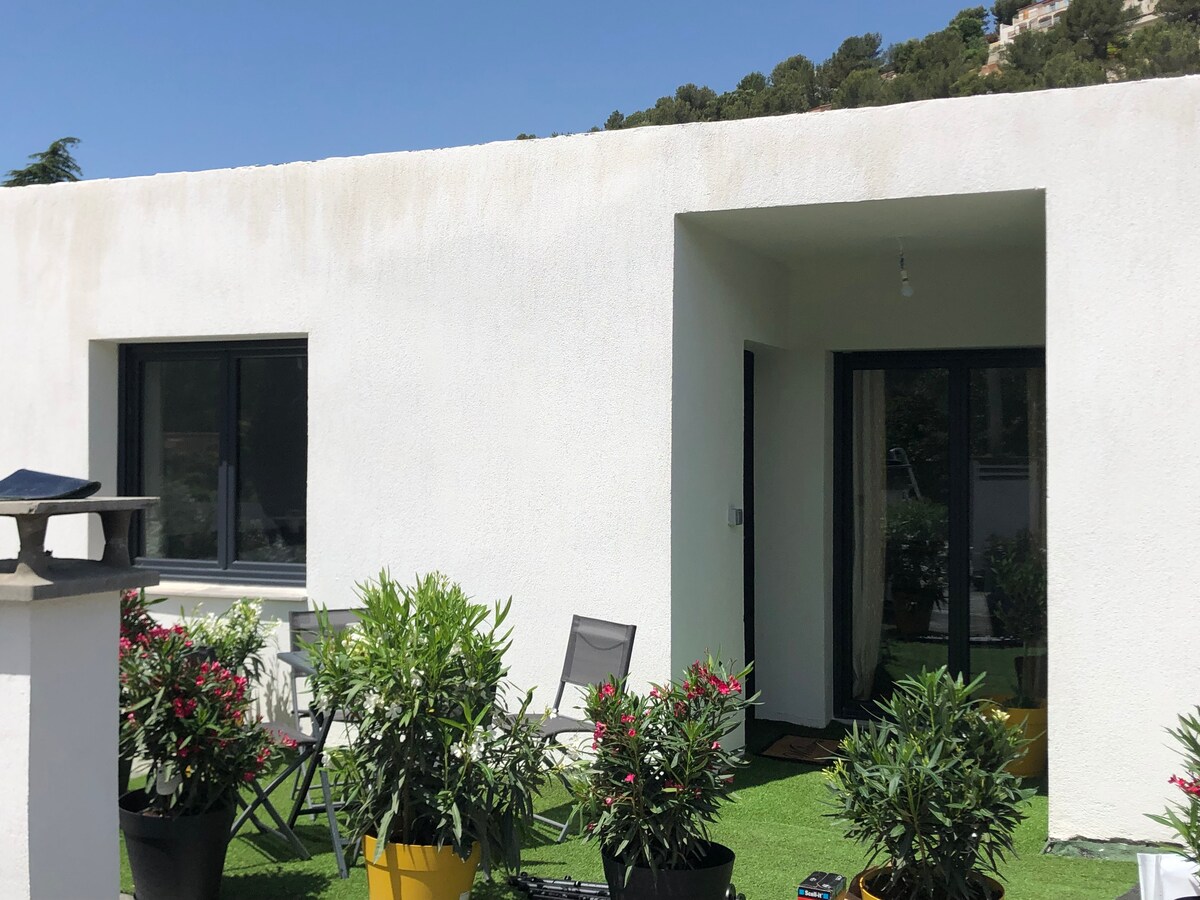 Proche de Cassis Studio de 30 m2 indépendant dans villa proche du centre ville . Terrasse privative avec accès à la piscine et non chauffée ( couverture solaire). Refait à neuf avec vue sur jardin et au calme. Canapé convertible avec matelas Bultex; cuisine aménagée (four, plaques de cuisson, frigo- congélateur, lave vaisselle, Machine à café Nespresso, grille pain, bouilloire ...). Salle de bains avec douche.