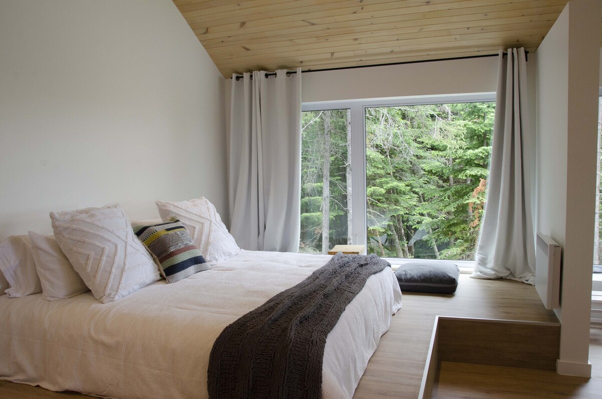Small Scandinavian chalet for two people ideally located to enjoy the attractions of Charlevoix. It has a thermal circuit (hot tub, sauna, hammam) Very intimate and in the middle of the woods, the view overlooks the majestic river and the mountains in the distance. All the modern equipment is there and the comfort is absolute A/C and outdoor fireplace. The open concept design was designed for an immersive experience in nature: large windows, panoramic shower. Access via a private road at 500 m.