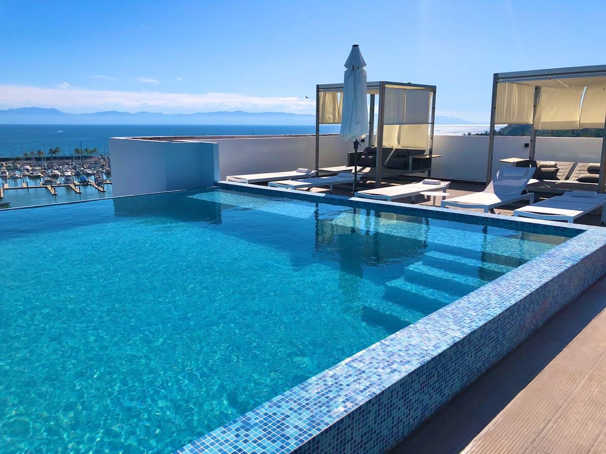 Brand new Studio apartment in Casa Infinito, Sayulita. Includes a private heated pool and infinite ocean views. Pillowtop king bed, high speed wifi and kitchenette. The mini private pool is heated. Enjoy wifi via Sayulitawifi to work from home, Smart TV, and a cozy pillowtop bed. This is the perfect romantic escape for a couple in a brand new ocean view complex just a minute drive to the beach. Common áreas include view gym and yoga deck with classes available daily