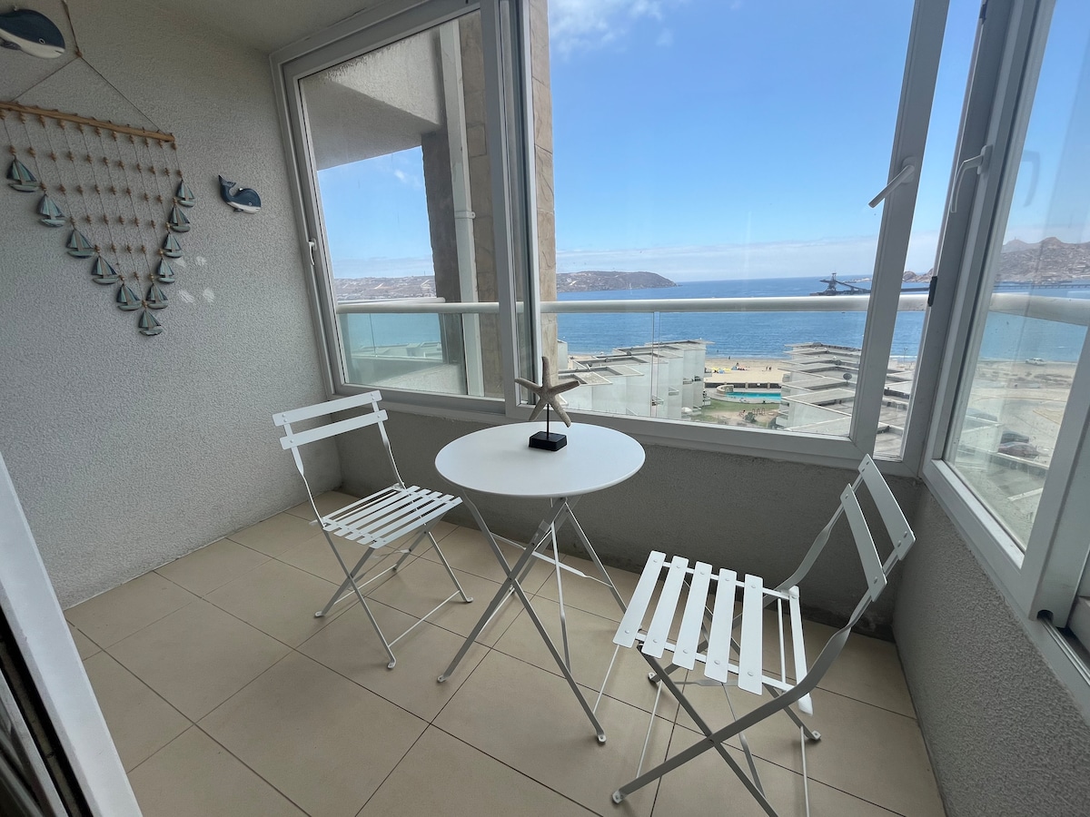 Espectacular apartamento con vista al mar en playa La Herradura,. Conexión directa a la autopista, con estacionamiento, a 3 minutos caminando de la playa, cruce seguro (puente peatonal). A pasos de restaurantes, supermercados, farmacias y otros comercios. Incluye las sillas de playa para que puedas ir cómodamente a la playa en familia. Acceso a piscina, gimnasio y quinchos dentro del recinto. *Actualmente hay una construcción al lado con ruido en horario laboral*