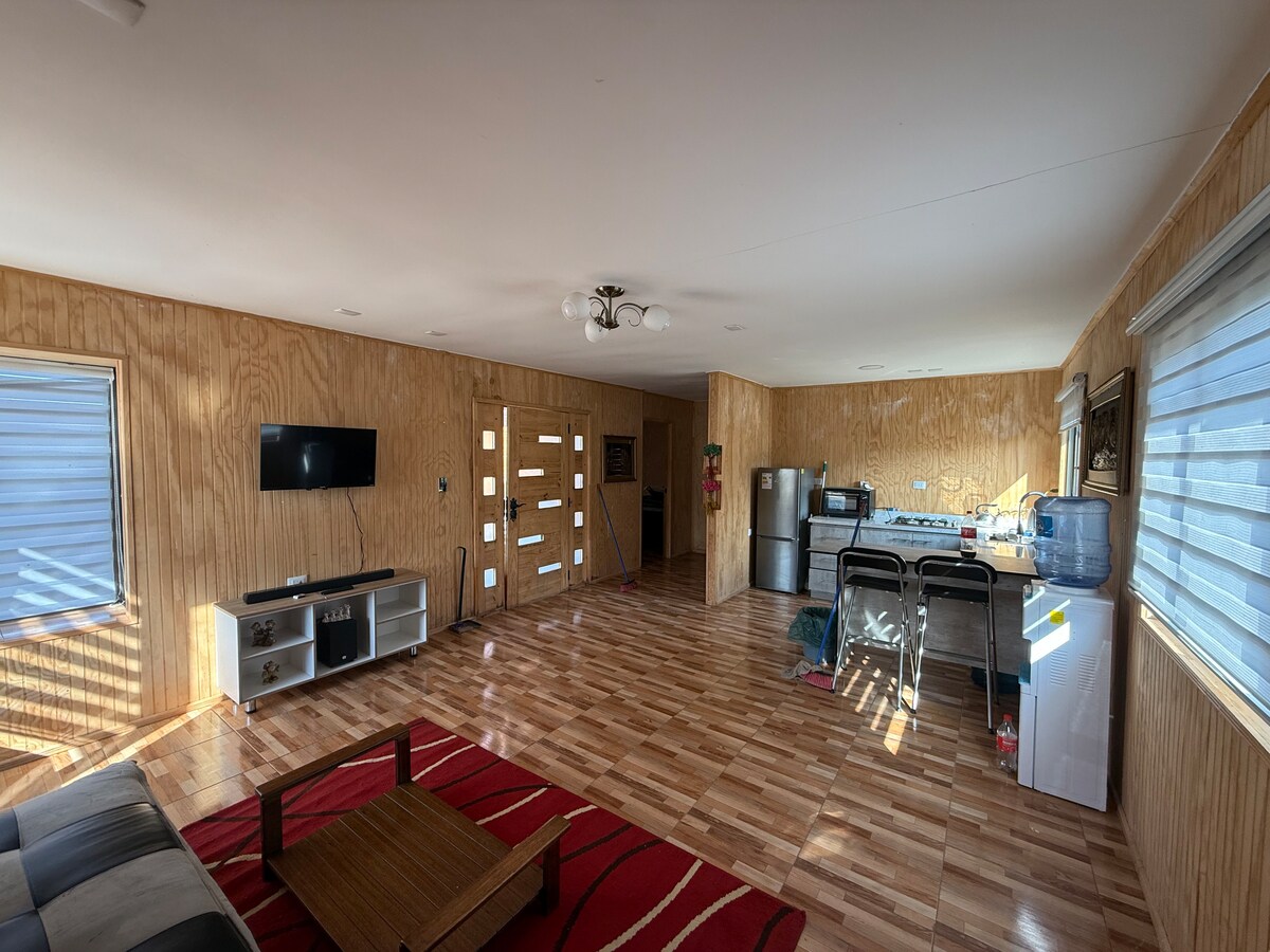 Ubicada a la entrada de la ciudad muy cerquita de la Ruta 5 Sur, sector muy tranquilo, con amplio espacio para estacionar a poco más de 2 kl de grandes supermercados, bencineras , a 20 min. del Salto del Laja. Cuenta con 2 dormitorios, cama 2 plazas, 1 cama de una plaza y una litera, dos baños completos principal en suite, amplia sala, sofá amplio y cocina.Los anfitriones viven al frente. Esperamos en el ingreso al recinto si es de noche para hacer mas expedita su llegada