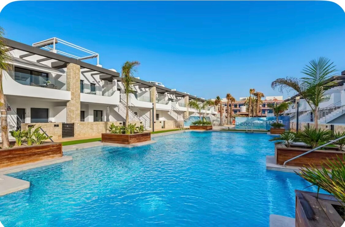 ✨ Brand-new vacation bungalow in Lago Jardín, Los Blacones Torrevieja. 1 bedroom with built-in wardrobe and Smart TV, 1 bathroom with walk-in shower, and living room with Smart TV (1500+ international channels) and A/C. High-speed Wi-Fi, furnished glass-enclosed terrace, and fully equipped kitchen. Community pool, on-site restaurant, only 2,5 km from the beach. Easy self check-in/out with PIN code and full guest support. 🌴 StayOrihuelaCosta #PRP007