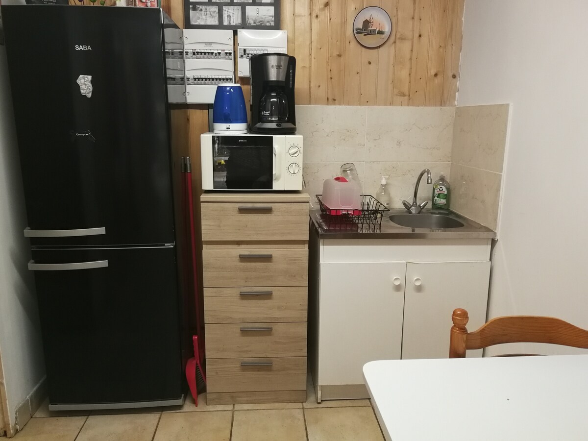 Studio-Gîte situé dans un hameau du bocage Climatisé pour l'été 20 m² - deux personnes - 1 lit de 140 x 200 (matelas récent) Gîte Indépendant classé deux étoiles en "meublé de tourisme" par la Vendée Entrée indépendante et parking privé Salle d'eau wc, coin cuisine et terrasse privative Lit fait et 2 serviettes de bain 70 x 140 Télévision, wifi, micro onde multifonctions, plaque induction, caf électrique et cafetière Dolce Gusto, bouilloire, toaster, aspirateur. Réfrigérateur tout utile